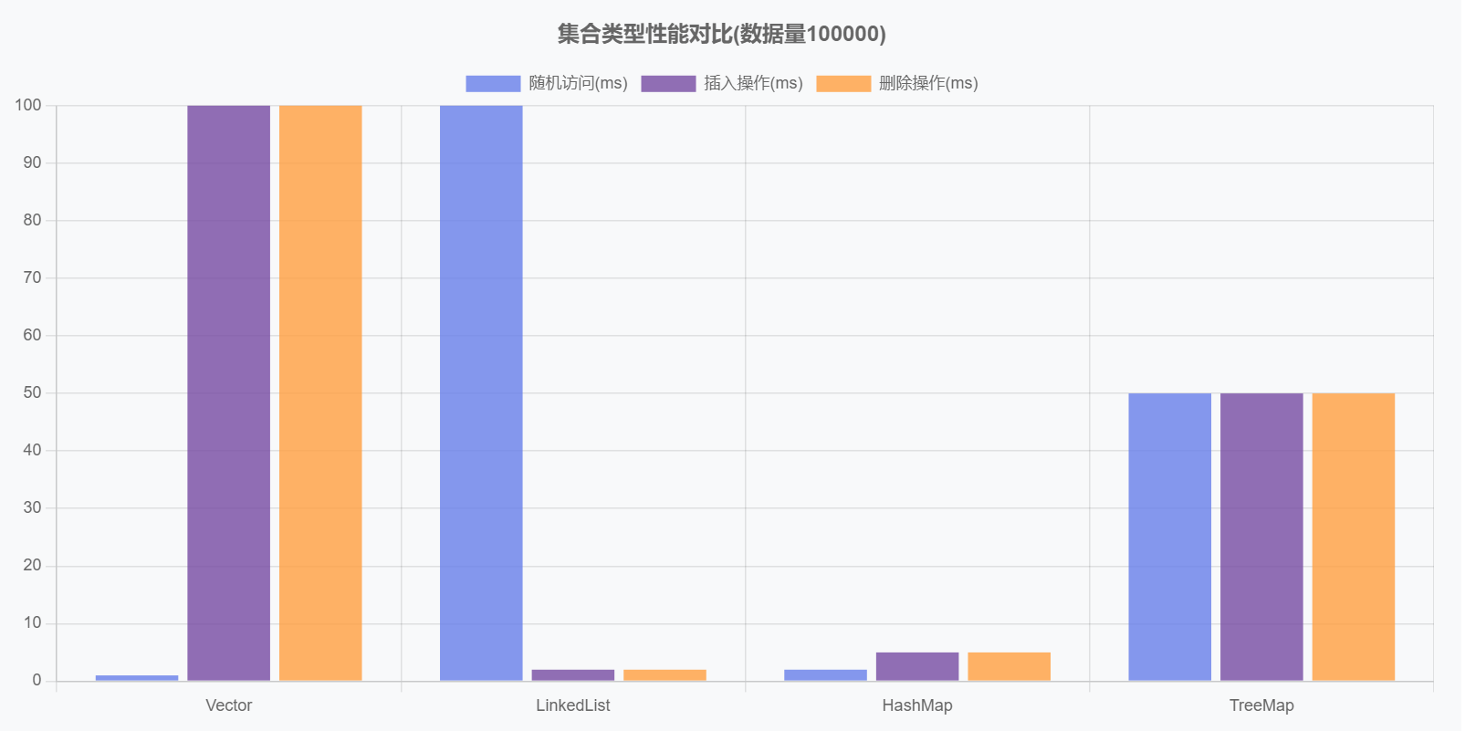 在不同的操作下,以ms为计量单位,测试数据量100000规模下,集合类型分析对比性能如下: