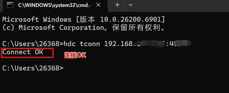 win+r 打开dos窗口,输入hdc tconn 192.168.xxx.xxx:端口号 (刚才手机上看到的 IP:端口号)