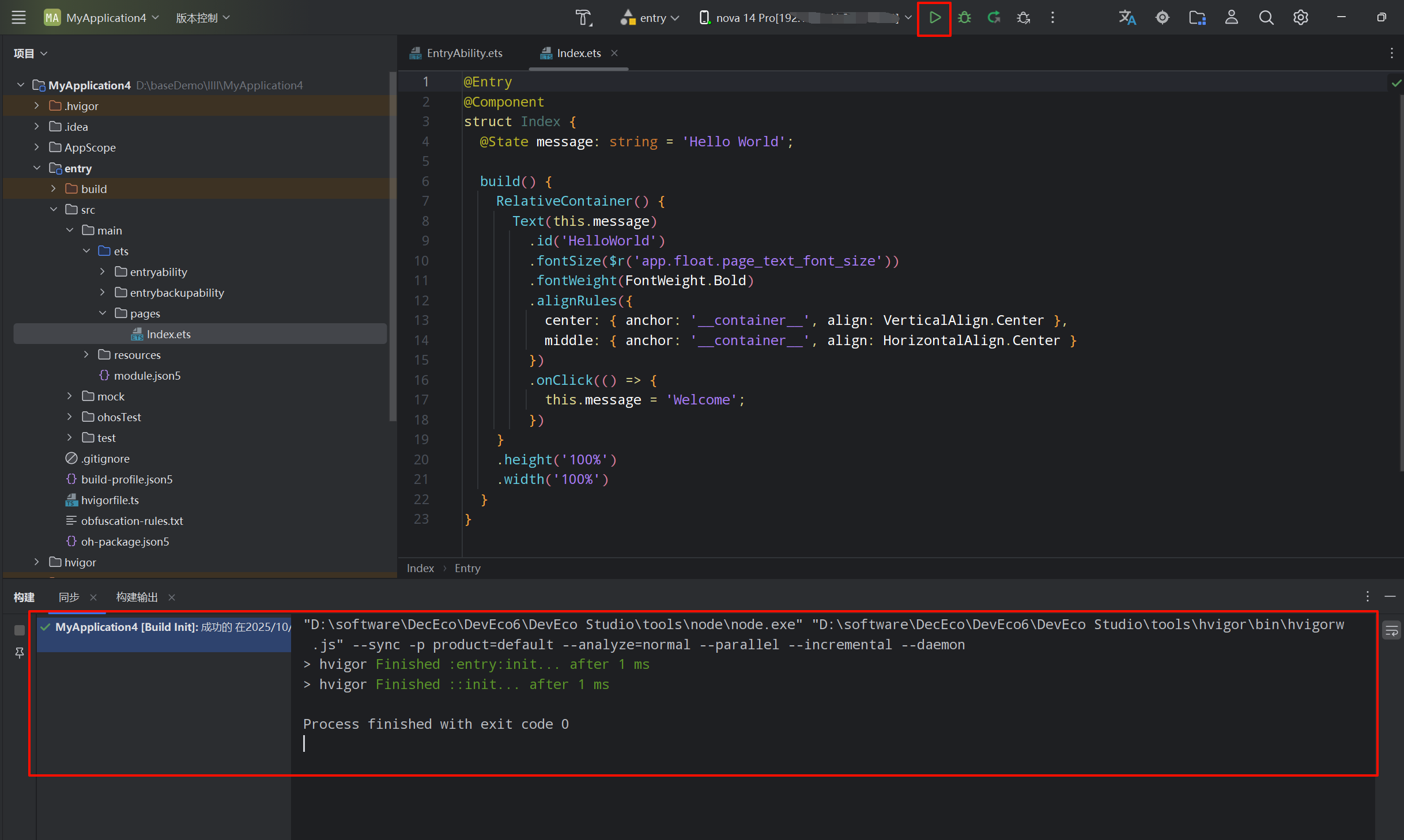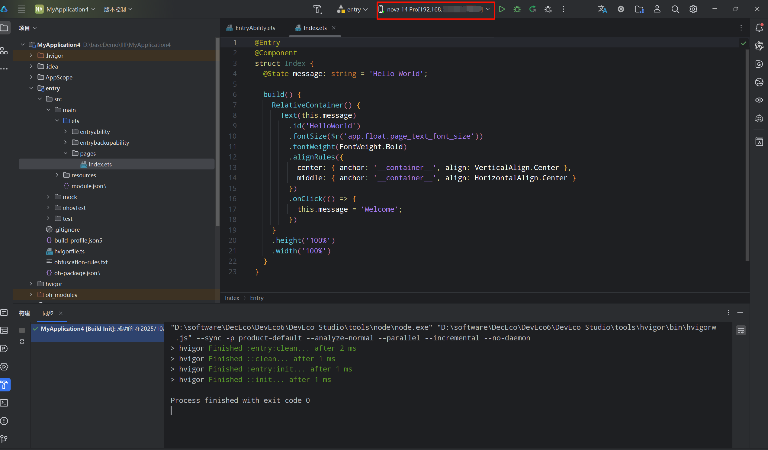 成功运行,显示初始化Hello World 页面,至此,就完成了真机的无线调试