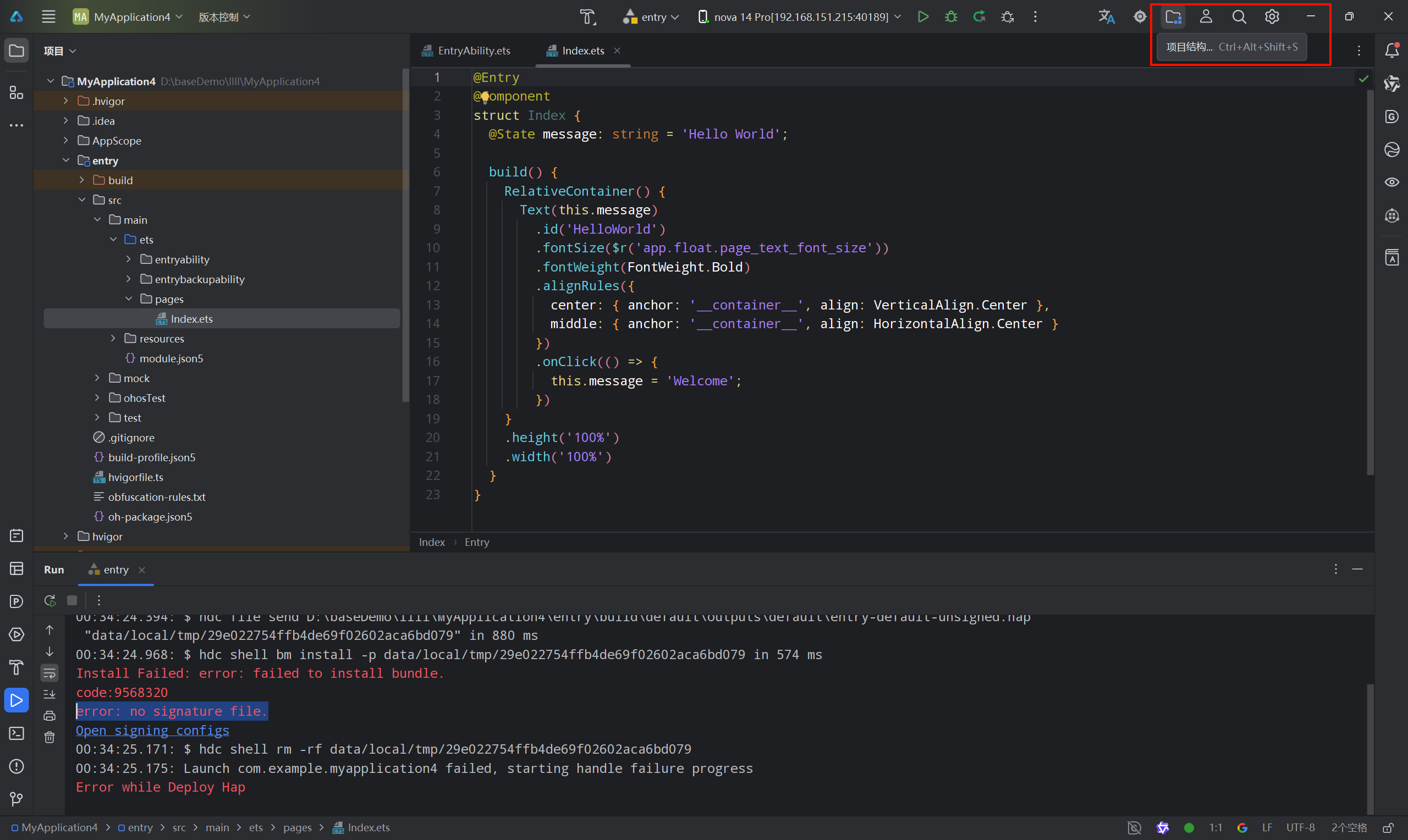 新建的项目,若是需要在真机上运行,需要配置签名信息