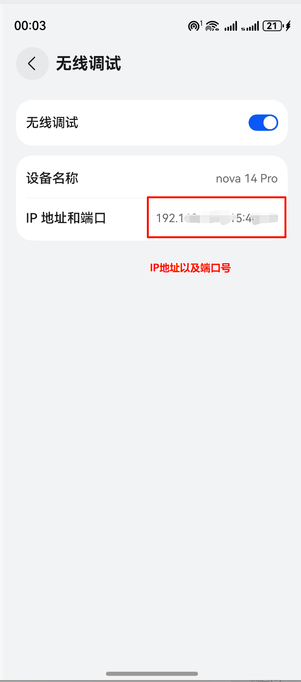 开启无线调试 ---> 获取到IP地址以及端口号 192.168.xxx.xxx:xxxx (记下IP以及端口号)