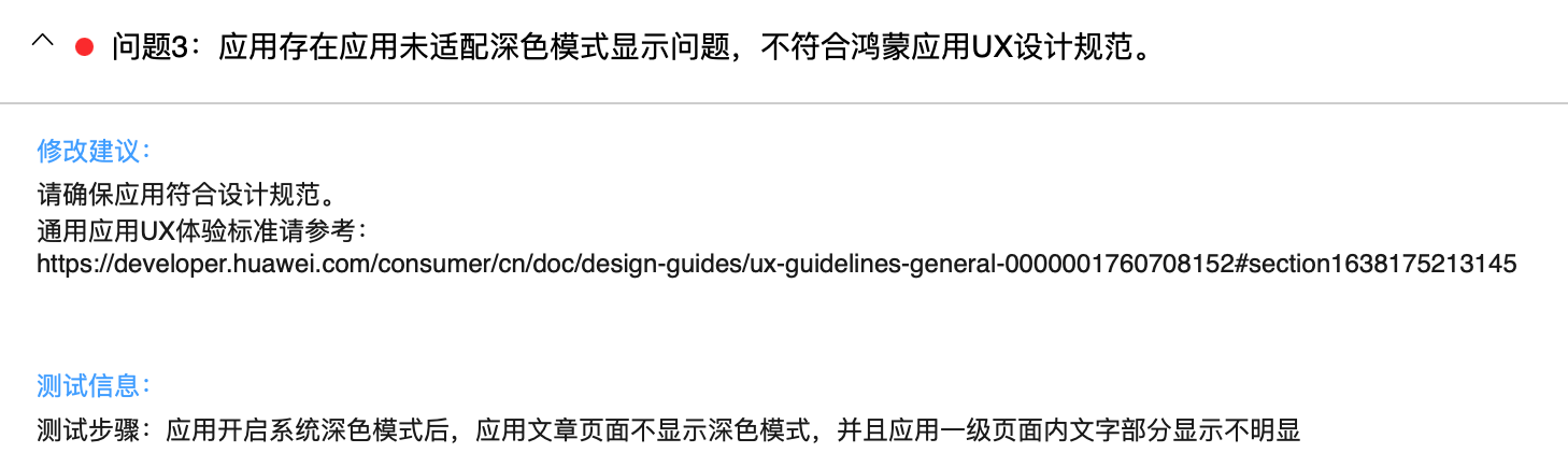 应用上架之前,如果你未考虑到深色模式,大概率会审核不通过,问题原因为:应用存在应用未适配深色模式显示问题,不符合鸿蒙应用UX设计规范。