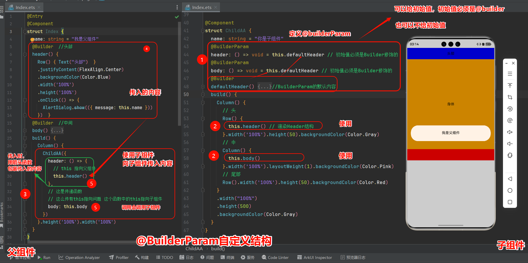 - 父组件传入的时候,传入的是用@Builder书写的结构