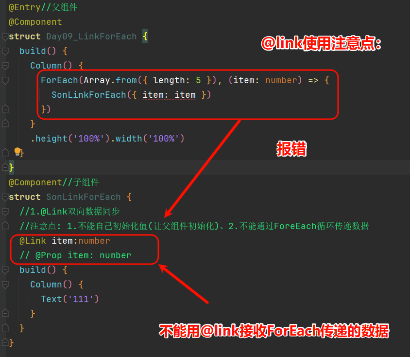 //注意点: 1.不能自己初始化值(让父组件初始化)、2.不能通过ForeEach循环传递数据