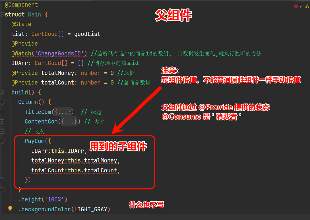 - 将父组件的状态属性使用@Provide修饰