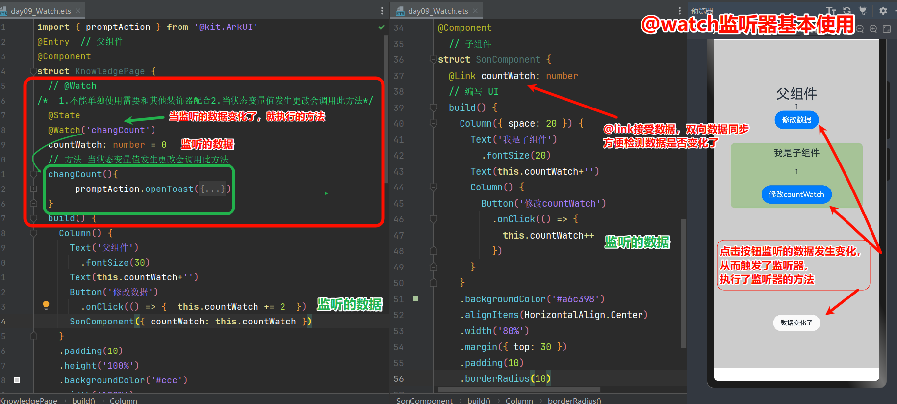 - @Watch无法单独使用,必须配合状态装饰器,比如@State、@Prop、@Link(@watch写在装饰器后面,变量的前面)