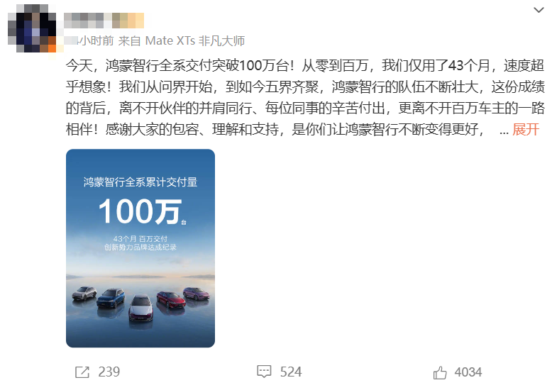 近日,华为常务董事、产品投资委员会主任、终端BG董事长余承东在社交媒体上发文称:鸿蒙智行全系交付突破100万台。