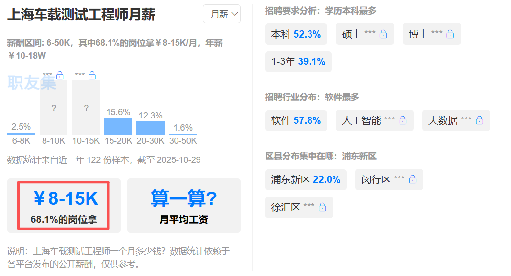 这种供需失衡直接体现在岗位待遇上,据职友集数据显示,以上海地区为例,车载测试工程师的薪酬区间为6-50K,多数岗位月薪集中在8-15K,年薪可达10-18万,高薪优势十分明显。