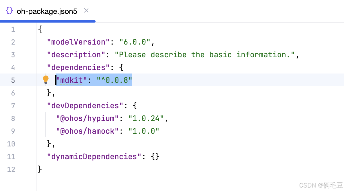 同时,在示例工程中,也建立了对mdkit的依赖,工程的oh-package.json5文件内容如下所示。