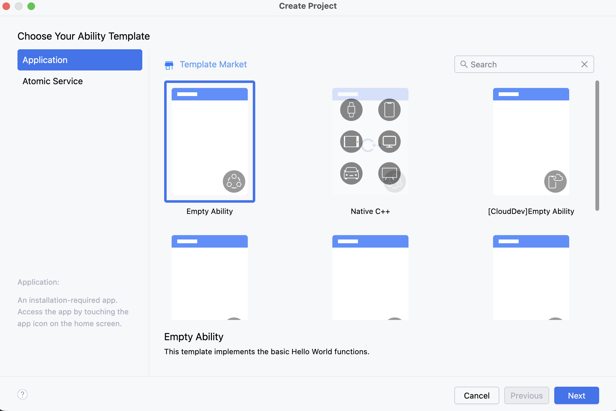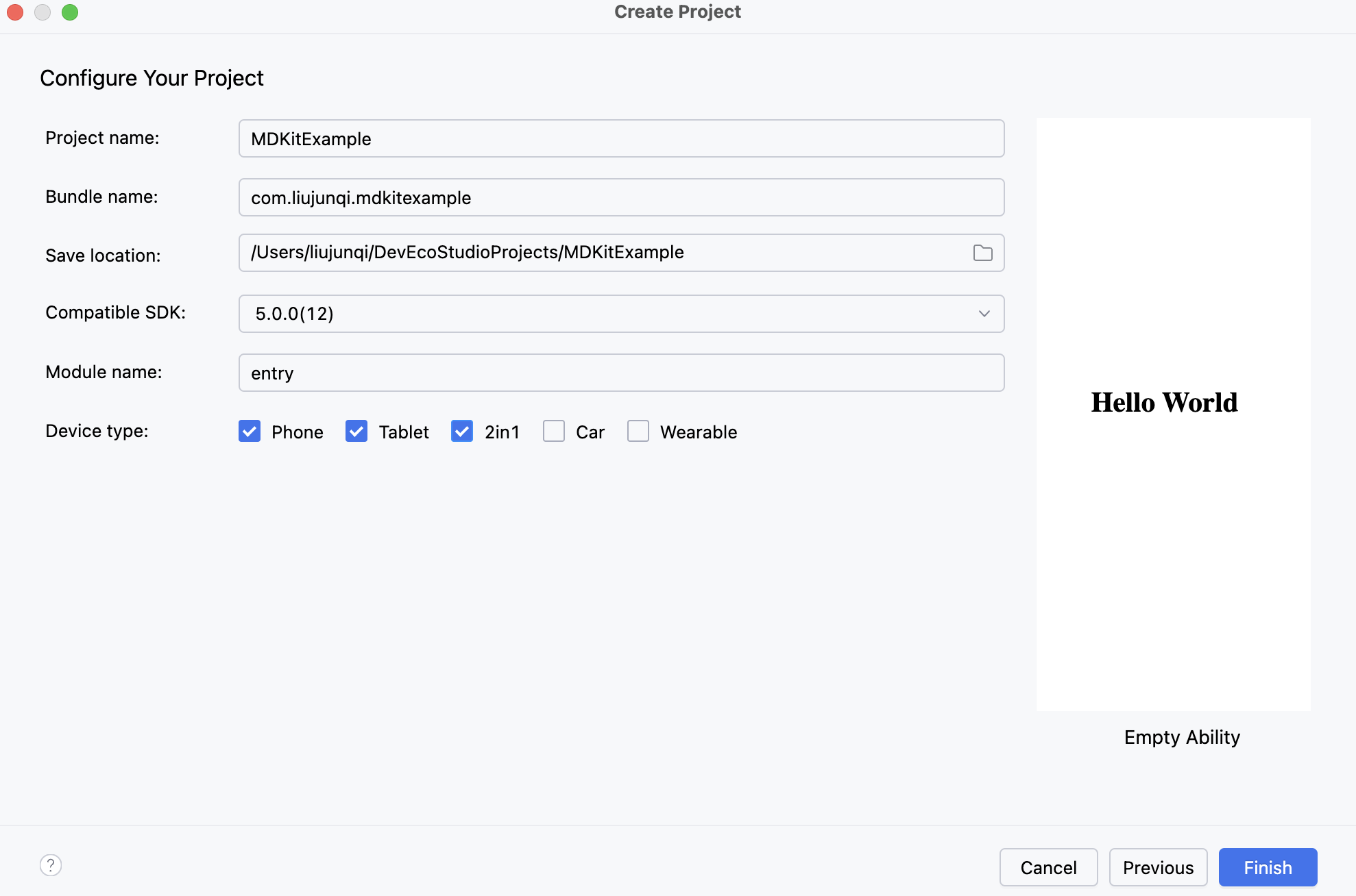 要使用三方的共享库,需要有项目工程,也就是我们平常研发时的App工程,本文中示例创建一个新示例项目,基于新的示例工程,从三方库中心仓中下载mdkit并使用。