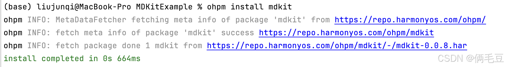 示例工程创建成功之后,在DevEco Studio的Terminal中,输入 ohpm install mdkit,则会自动的安装mdkit,如下图所示,安装成功