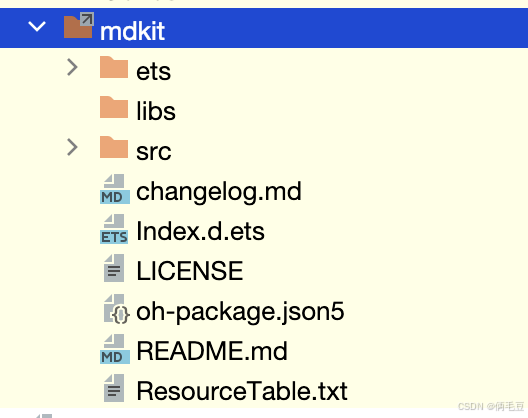 点击该目录,可查看mdkit中的文件,包括二进制产物相关文件,和上一节内容中介绍的文件(readme、changelog、LICENSE和oh-package.json5)。