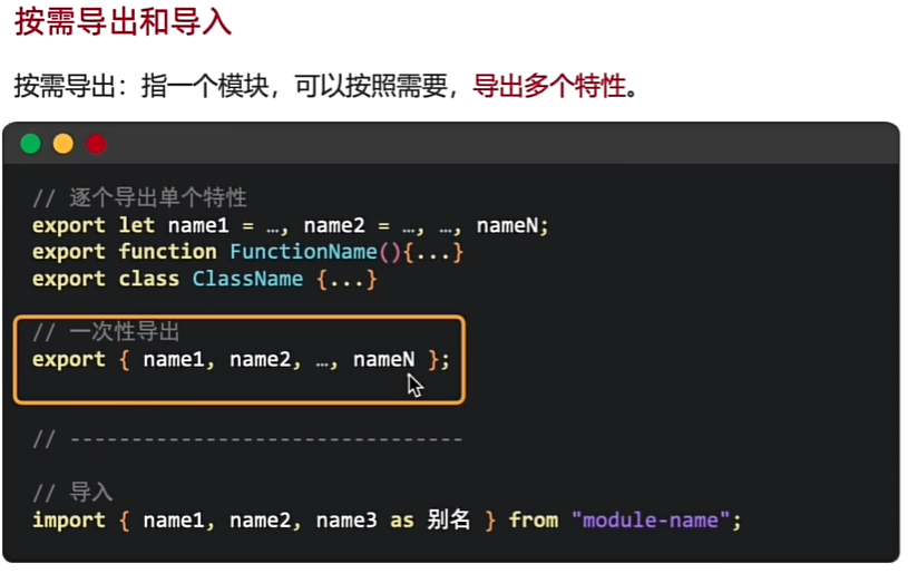 一个模块可以按需导出多个变量、函数或类,通过花括号结构化导入。