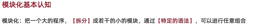 模块化(Module)指将一个大型程序拆分为多个可独立维护的小模块(文件),每个模块拥有独立的逻辑与作用域,