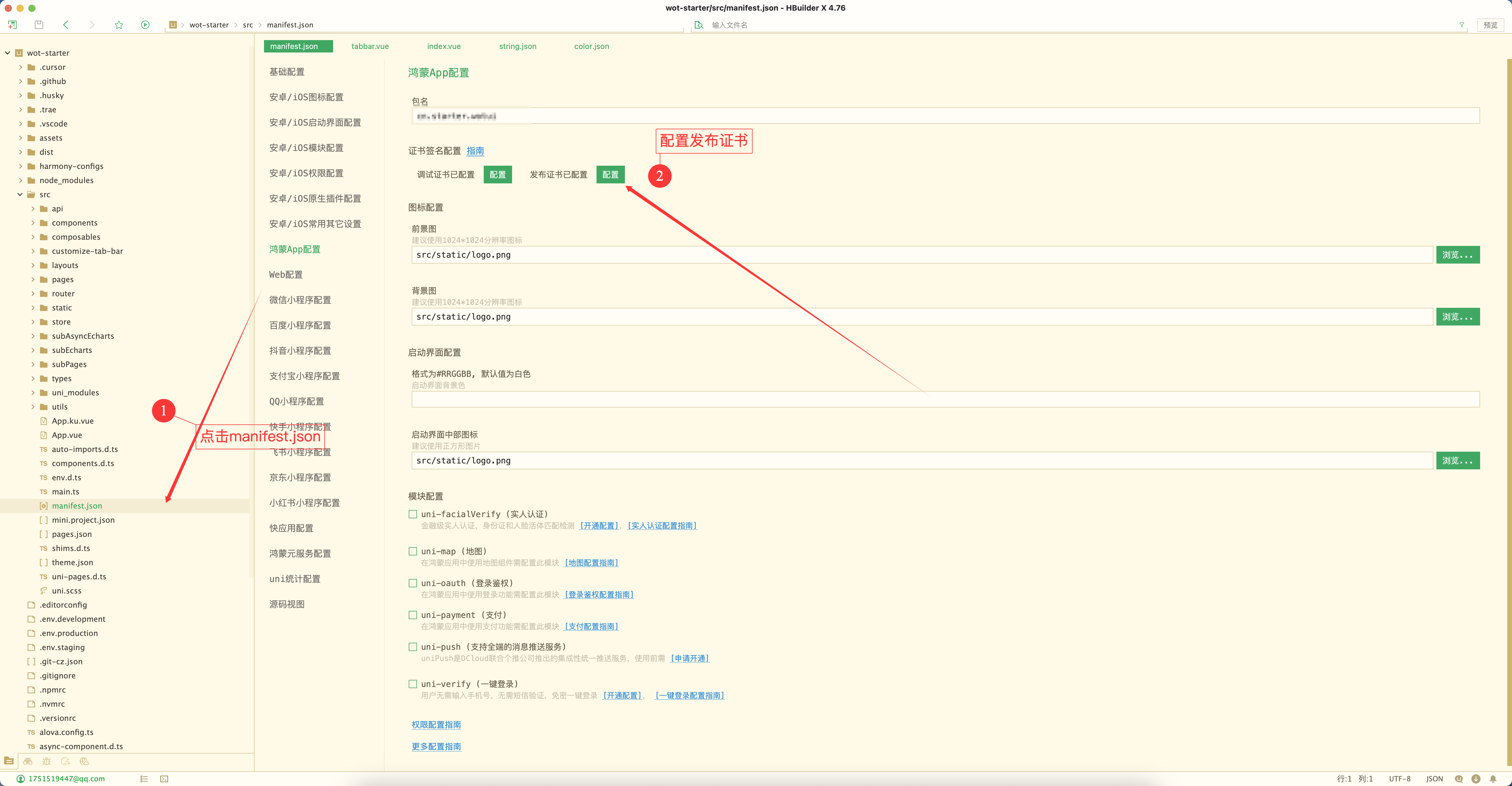 - manifest.json 中配置的证书信息,主要是 app-harmony 对应的内容要手动同步到