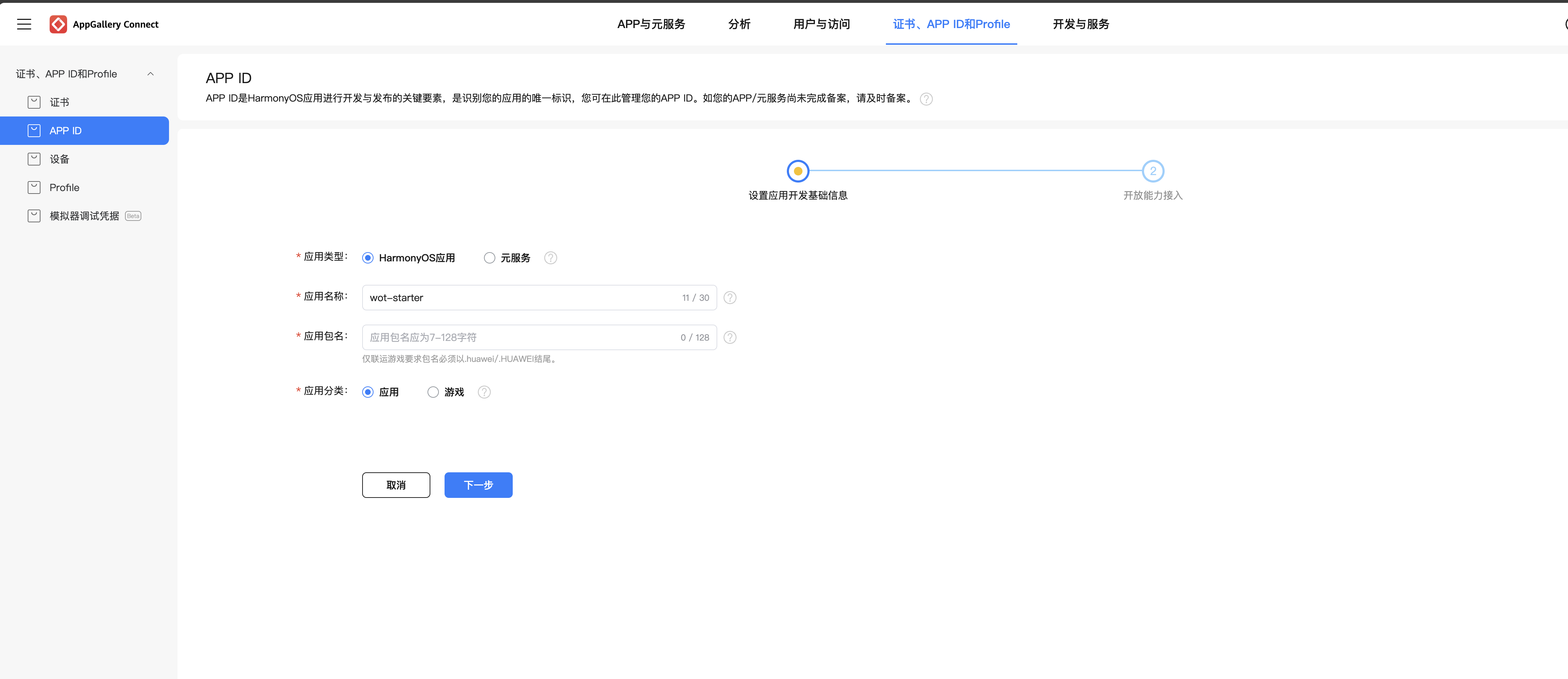 我们访问https://developer.huawei.com/consumer/cn/service/josp/agc/index.html#/harmonyOSDevPlatform/172249065903274453,注册账号并新建一个 APP ID,这一步我们在申请调试证书时应该已经做过。