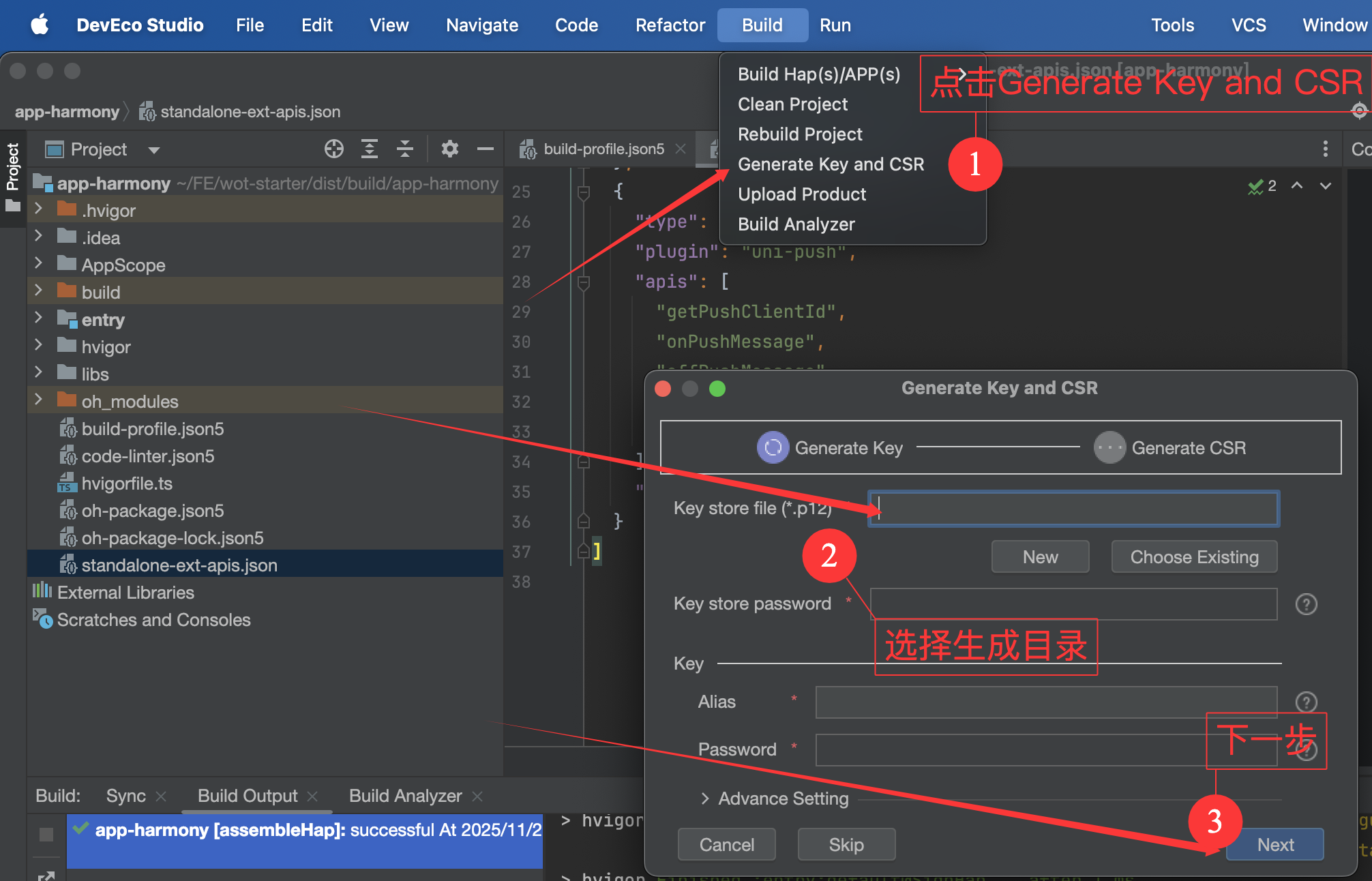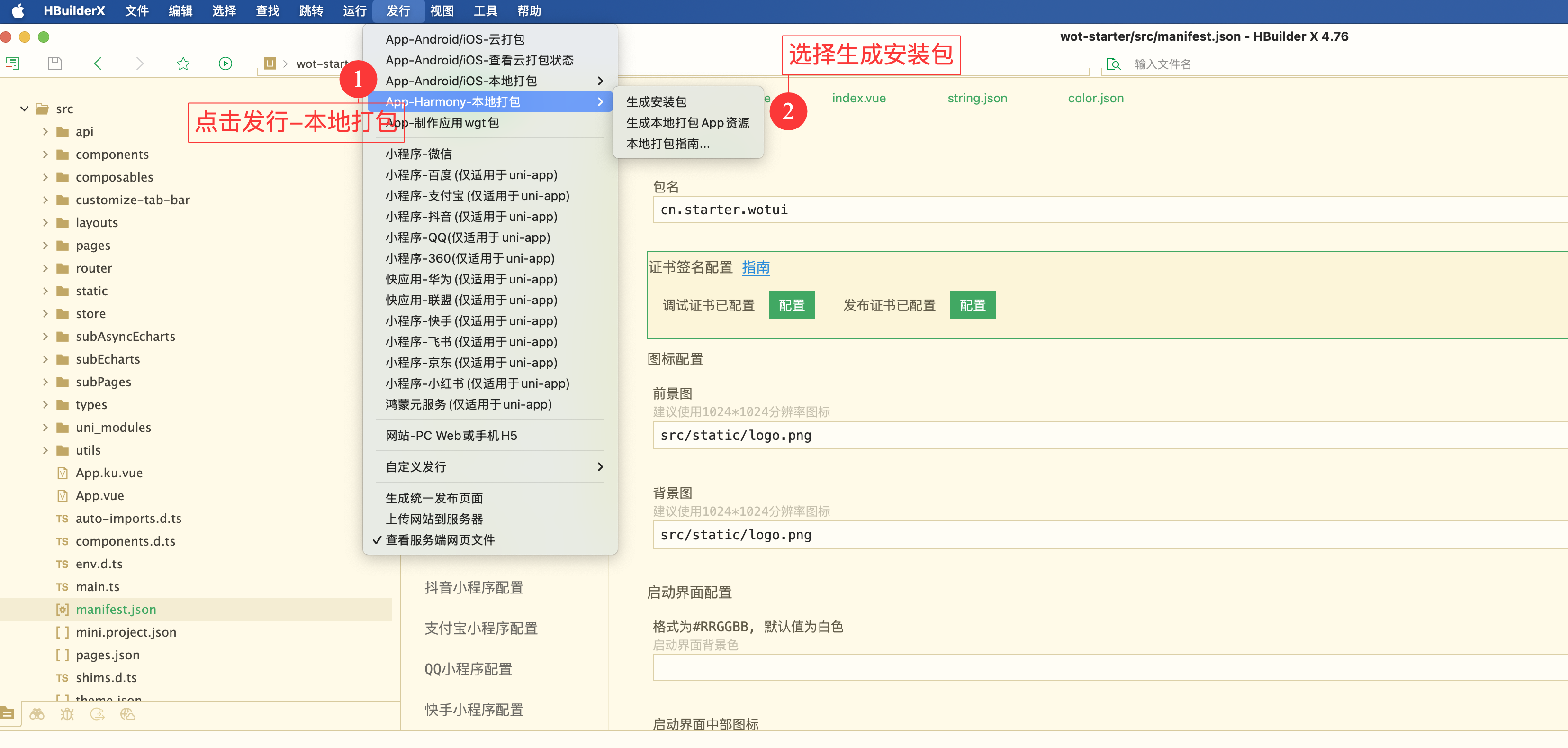 我们在 hbuilderx 中配置打包证书,参考教程:https://uniapp.dcloud.net.cn/tutorial/harmony/runbuild.html#signing-configs