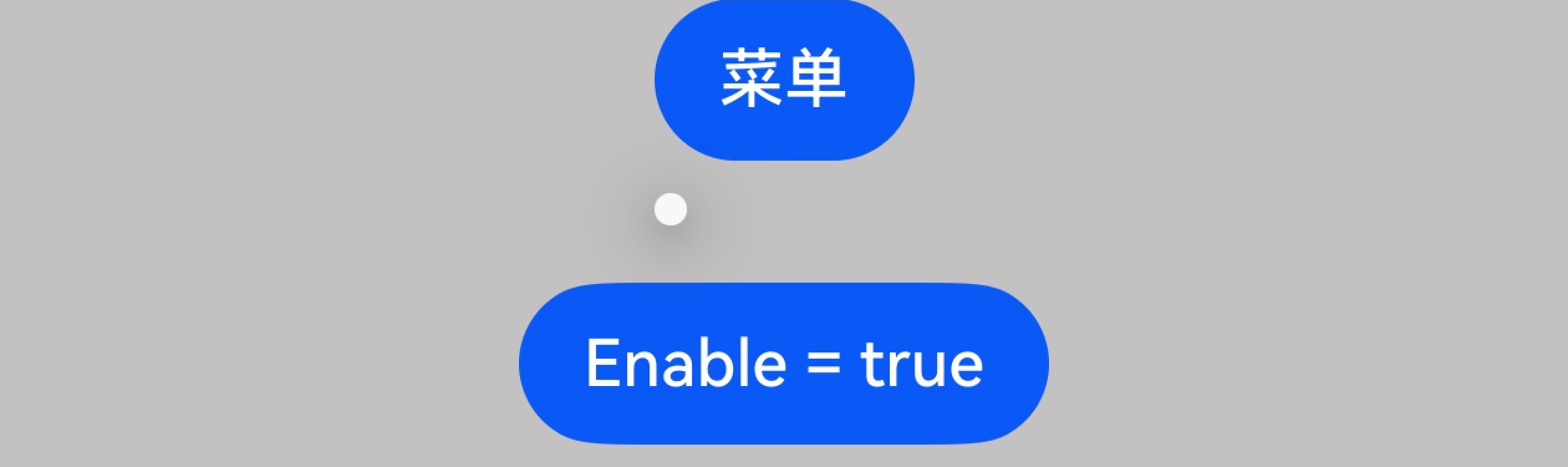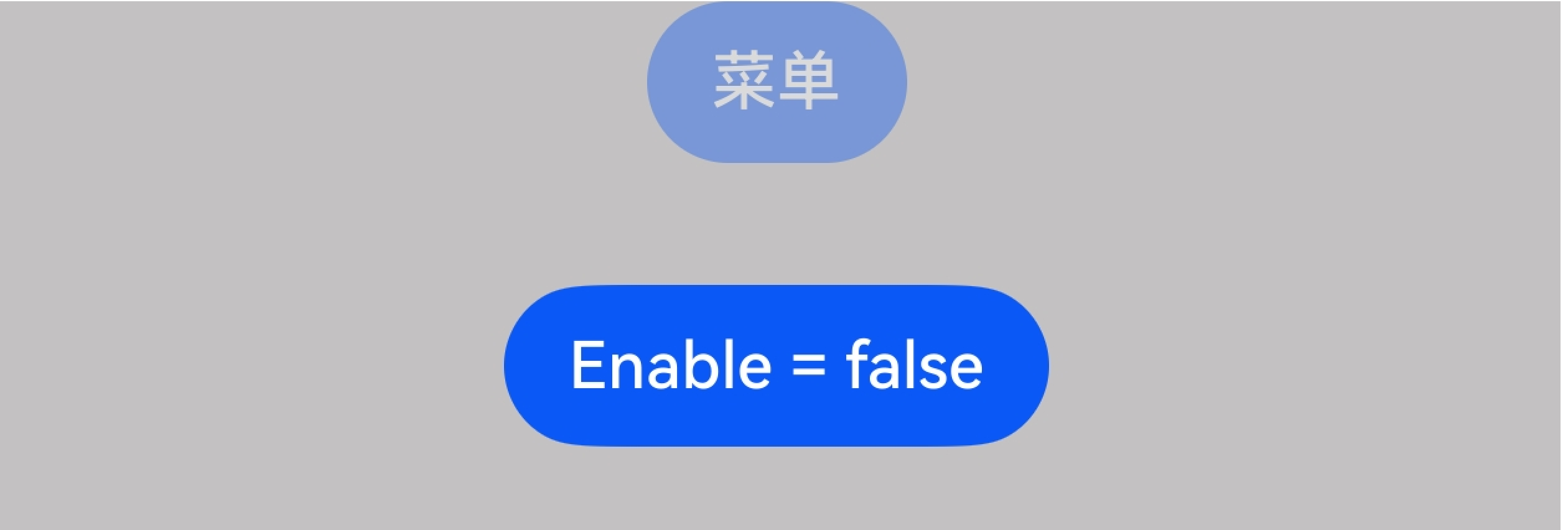 @Entry @Component struct menu { @State enabled_param: boolean = true @Builder MyMenu() { Menu() } build() { Column({ space: 30 }) { Button('菜单') .bindMenu(this.MyMenu) .enabled(this.enabled_param) Button('Enable = ' + this.enabled_param) .onClick(() => { this.enabled_param = !this.enabled_param }) } .width('100%') .height('100%') .alignItems(HorizontalAlign.Center) .backgroundColor(Color.Grey) } }以下是两种效果图: