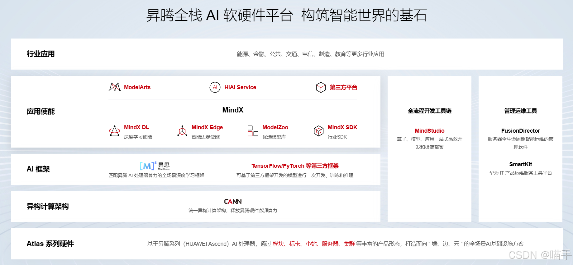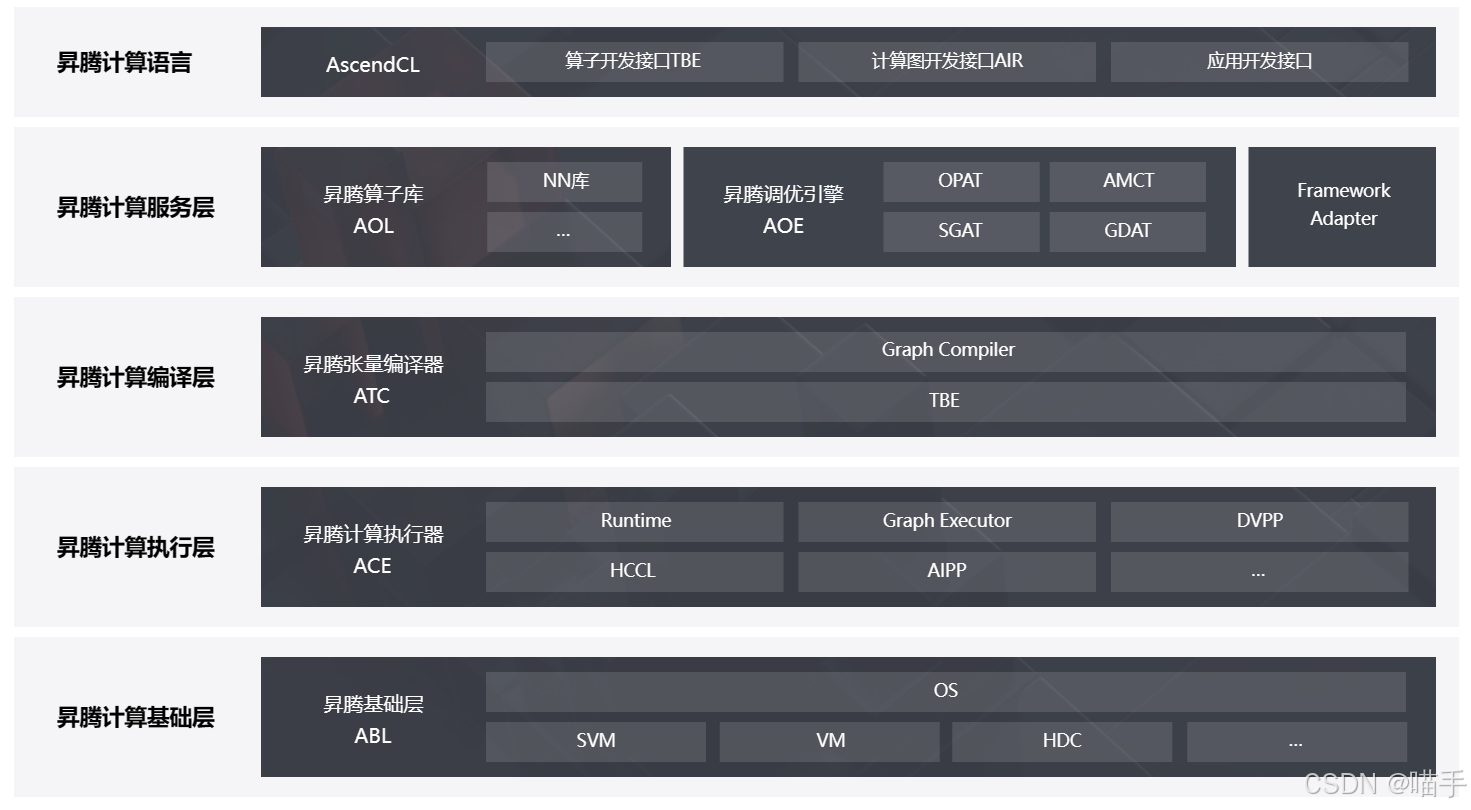 昇腾 AI 异构计算架构 CANN 可以被抽象成五层架构: