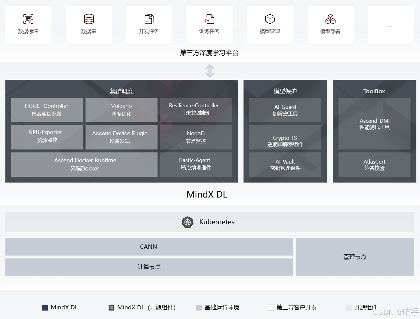 - 对下(硬件层):ACLNN 算子的底层实现深度适配了昇腾 NPU 的硬件特性(AI Core、Vector Core、Cube 单元等),实现了极致优化。