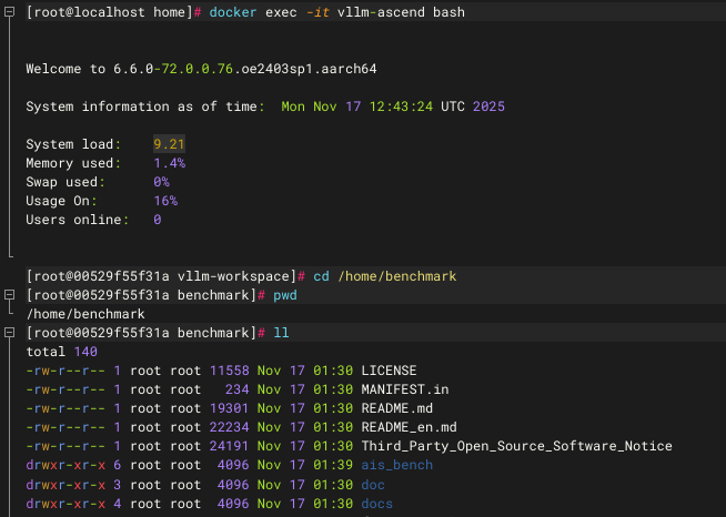 如下图,AISBench安装在vllm-ascend容器的/home/benchmark目录下
