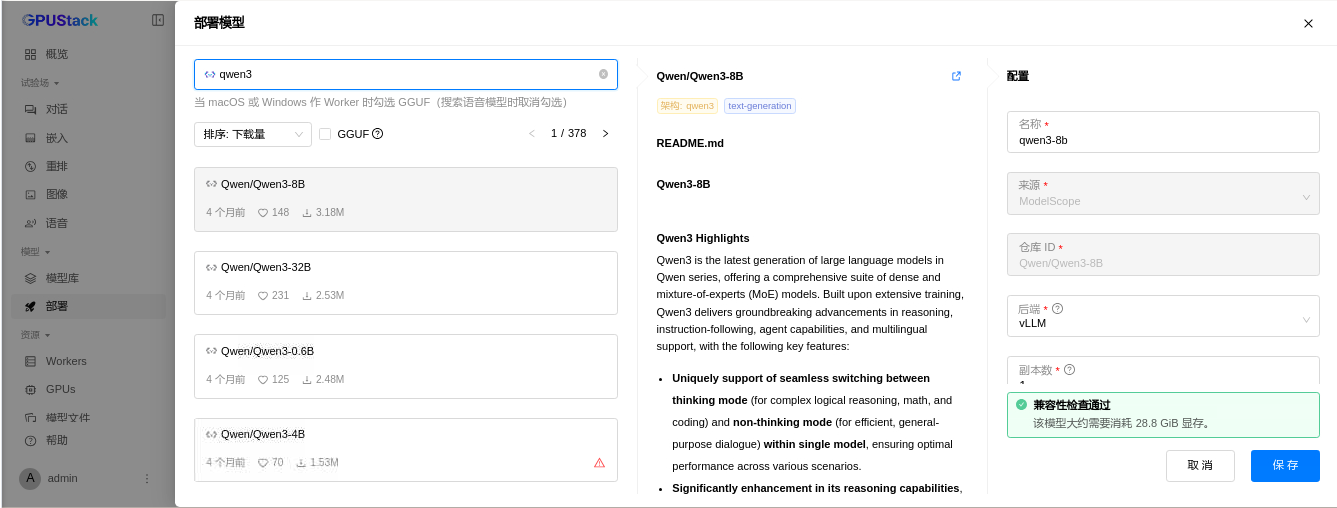 GPUStack安装好之后,可以直接通过网页下载modelscope.cn网站的vllm格式模型文件,后续的操作以vllm格式模型为例。