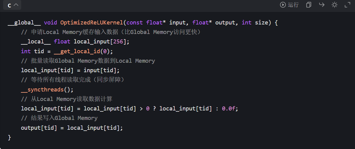 - 内存优化:通过 “数据复用” 减少内存访问 —— 比如将多次使用的输入数据缓存到 Local Memory,演示代码如下: