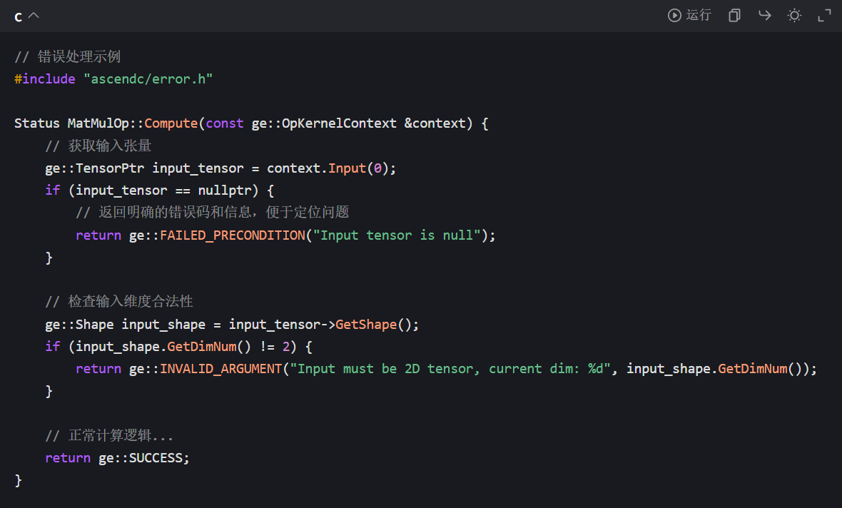新手开发时最怕 “报错无头绪”,Ascend C 提供了结构化的错误处理机制和调试接口: