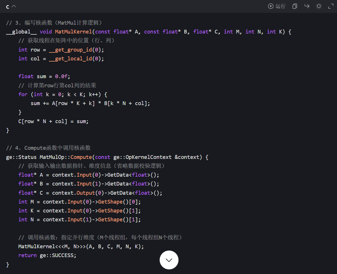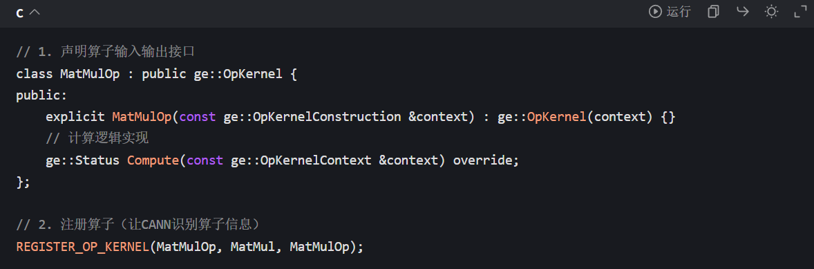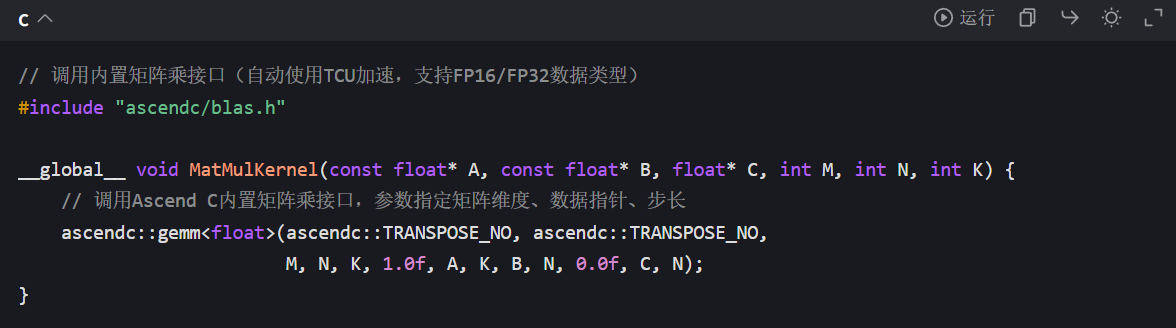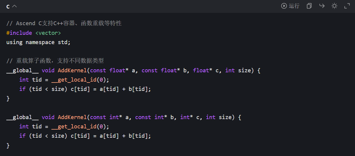 Ascend C 遵循 C/C++11 及以上标准,同时提供硬件专属扩展,让熟悉 C/C++ 的开发者能快速上手: