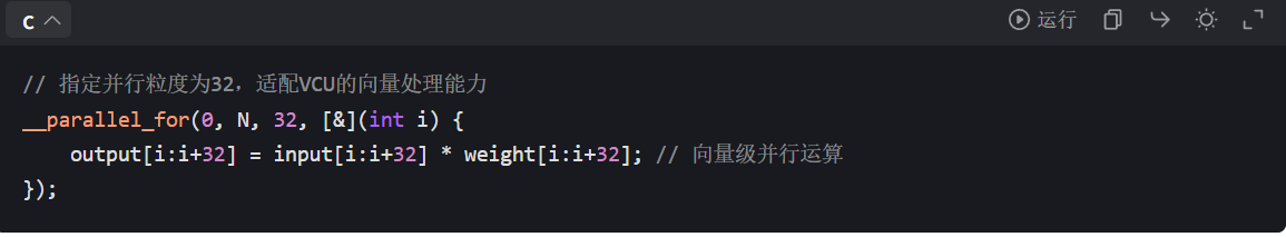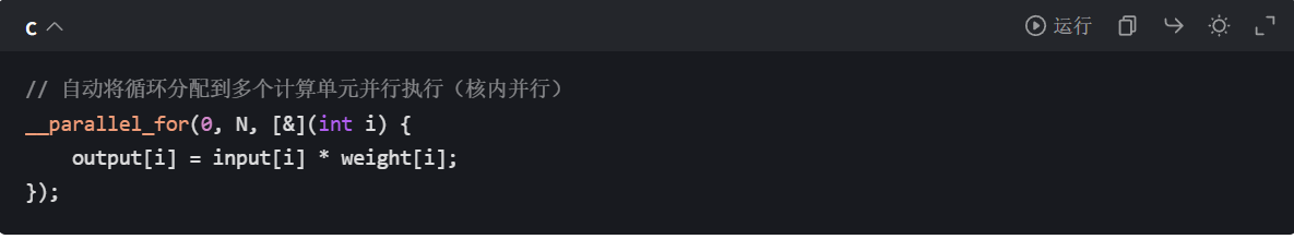 __parallel_for是 Ascend C 的核内并行关键字,编译器会根据循环次数 N、硬件计算单元数量,自动拆分循环任务到多个 VCU 线程中执行;如果 N 较大,还会触发 TCU 的向量并行指令,进一步提升计算效率。 - 扩展用法:通过
