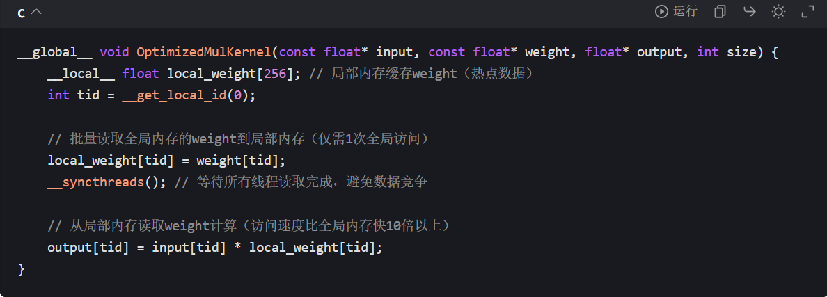 示例:利用__local__缓存热点数据,减少全局内存访问: