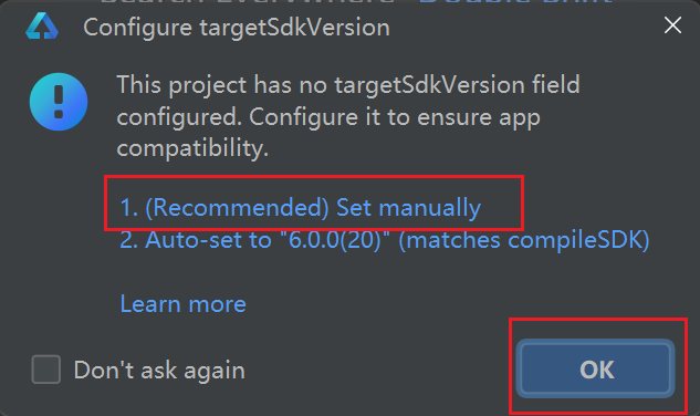 第一次打开,会提示让添加目标sdk版本,选择1:
