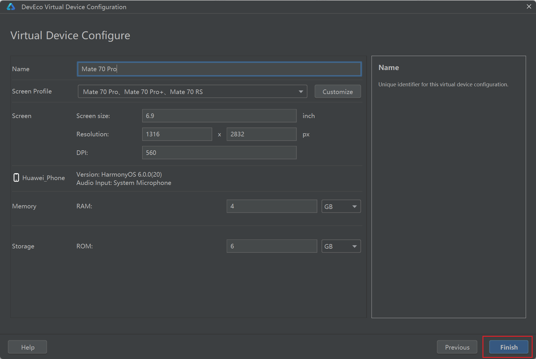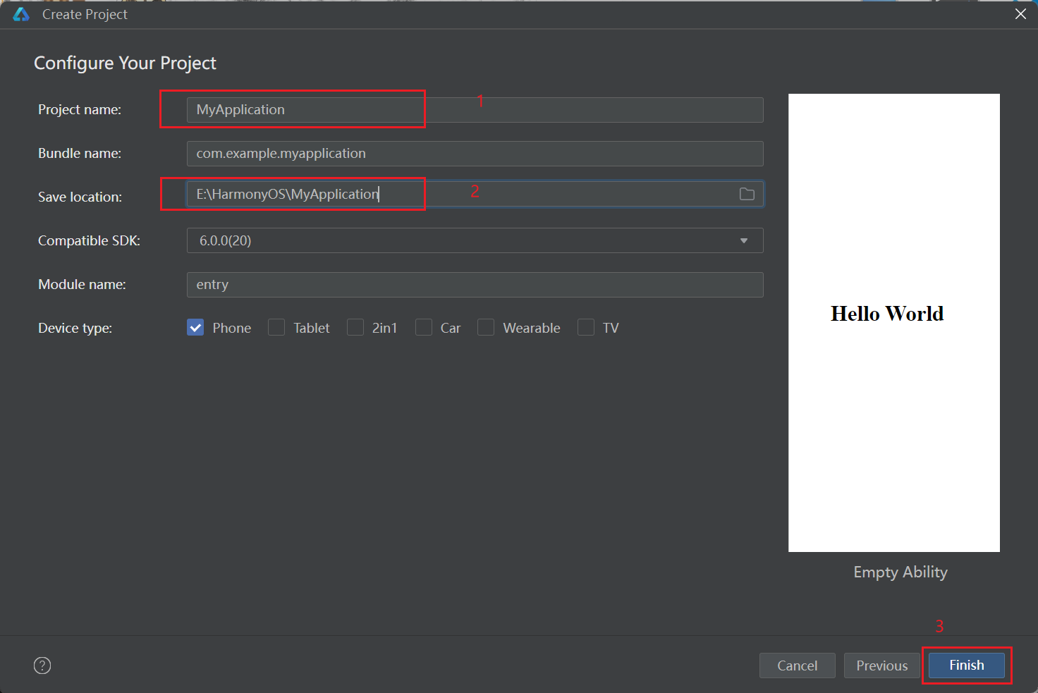 给你的项目起名,并选择你要保存Harmony项目的文件夹,点击Finish: