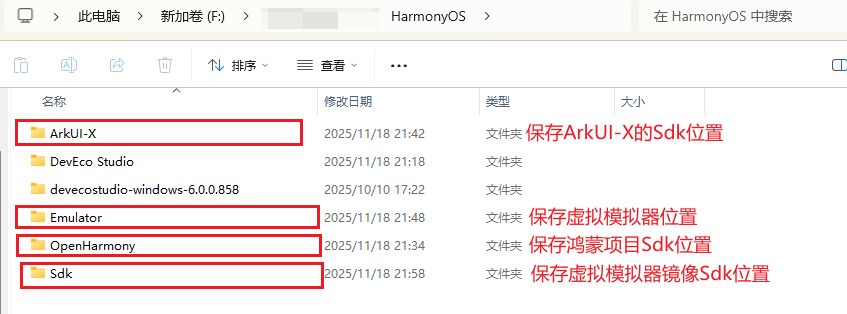 本次安装需要以下几个文件夹,可以提前创建:在任意盘下创建HarmonyOS文件夹: