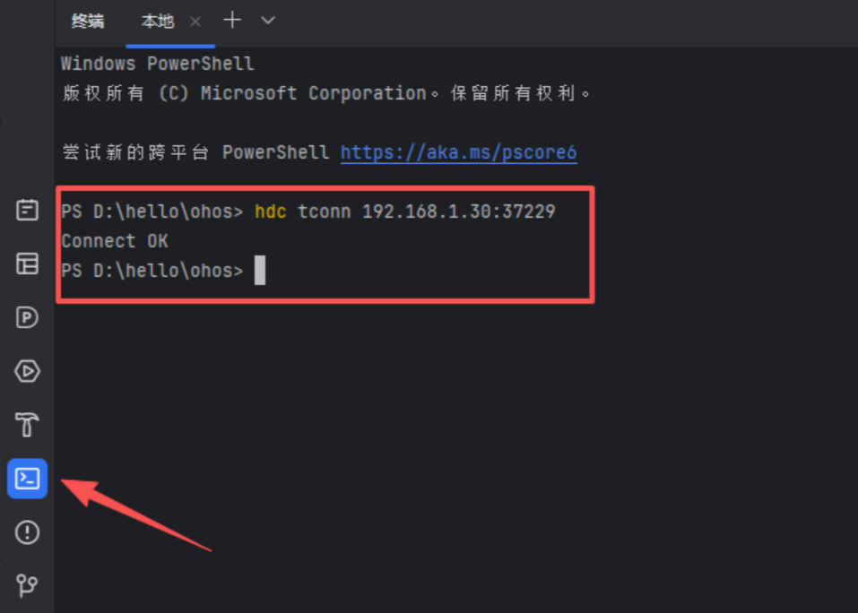 打开终端,执行hdc tconn IP:端口号(IP和端口号,在需要调试的设备上,打开开发者模式,在无线调试页面查看)