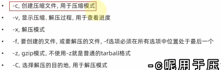 语法:tar [-c -v -x -f -z -C] 参数1 参数2......参数n