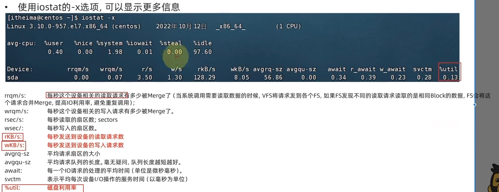 iostat查看CPU、磁盘的相关信息:iostat [-x] [num1] [num2](-x:显示更多信息;刷新间隔;刷新几次)