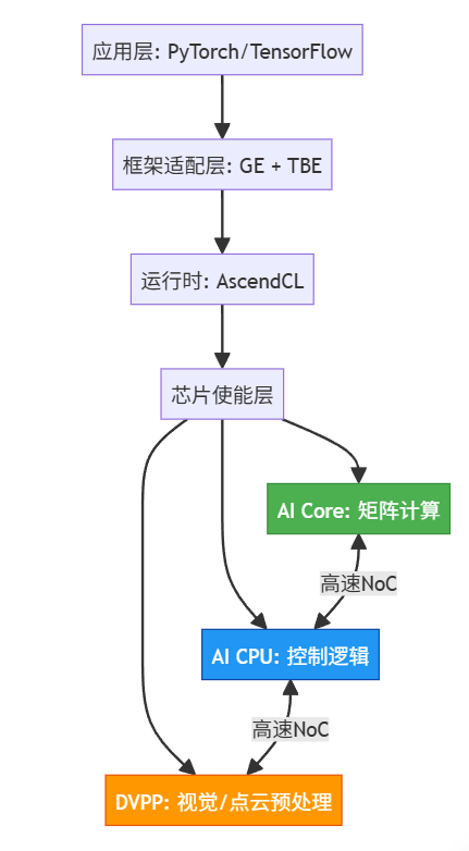 芯片使能层是 CANN 的核心竞争力所在。其中 AscendCL 编程接口向上对接 PyTorch、TensorFlow 等主流框架,向下通过图引擎(GE)和张量加速引擎(TBE)实现算子优化。特别值得注意的是昇腾 AI 处理器的异构计算单元:AI Core 负责矩阵运算,AI CPU 处理控制逻辑,DVPP 单元则专门加速图像预处理,三者协同工作实现算力最大化。