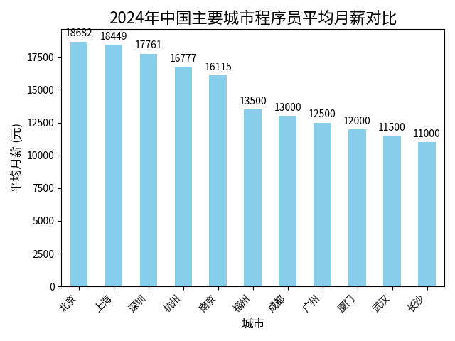 根据2024年的数据,全国程序员的平均月薪约为15,302元 [2]。然而,一线和新一线城市依然是高薪程序员的聚集地。下图展示了2024年中国主要城市程序员的平均月薪对比情况。