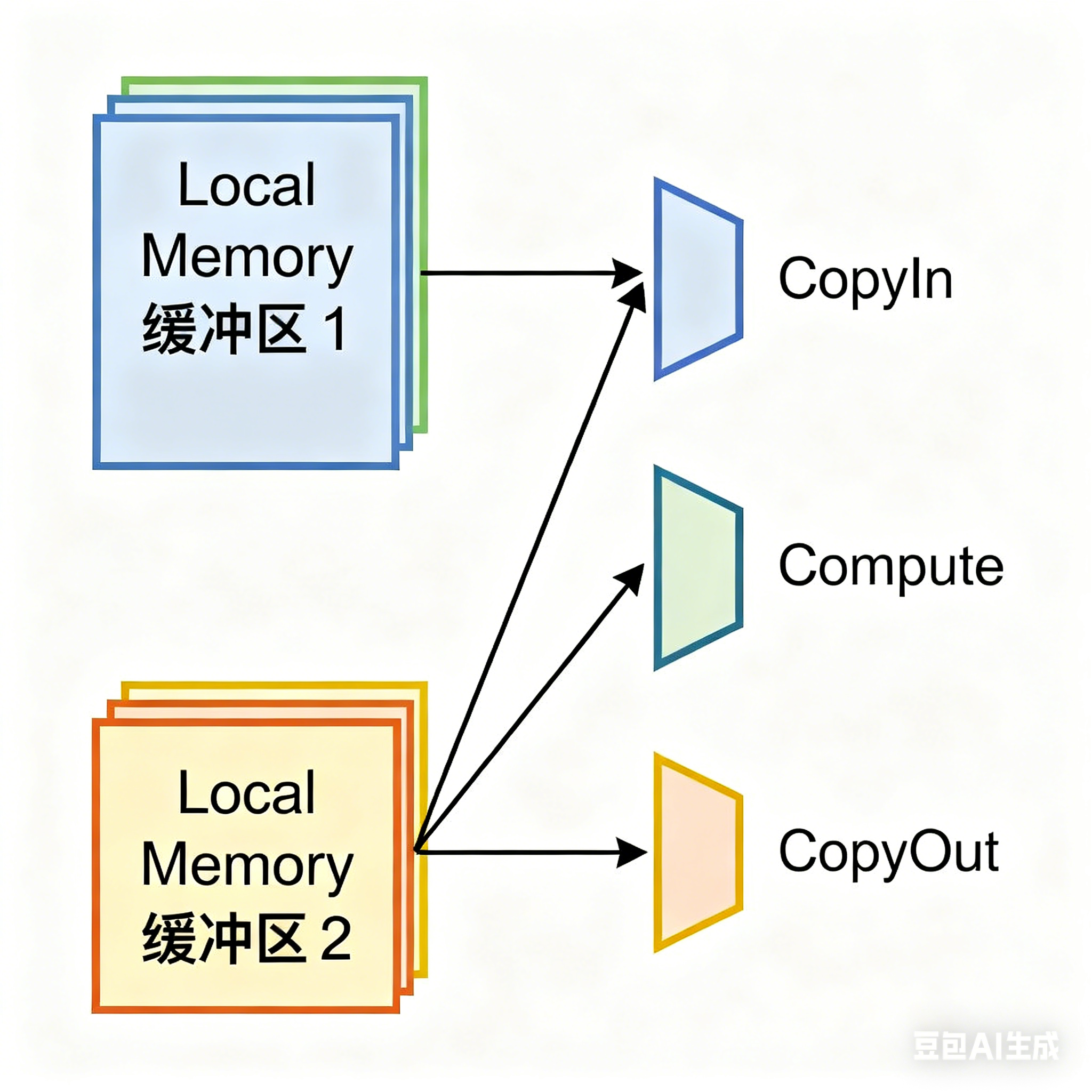 优化原理:当 Compute 单元处理缓冲区 1 的数据时,CopyIn 单元同时搬运数据至缓冲区 2;切换计算缓冲区 2 时,CopyOut 单元同步写出缓冲区 1 的结果,使 Vector 单元利用率从 1/3 提升至接近 100%。