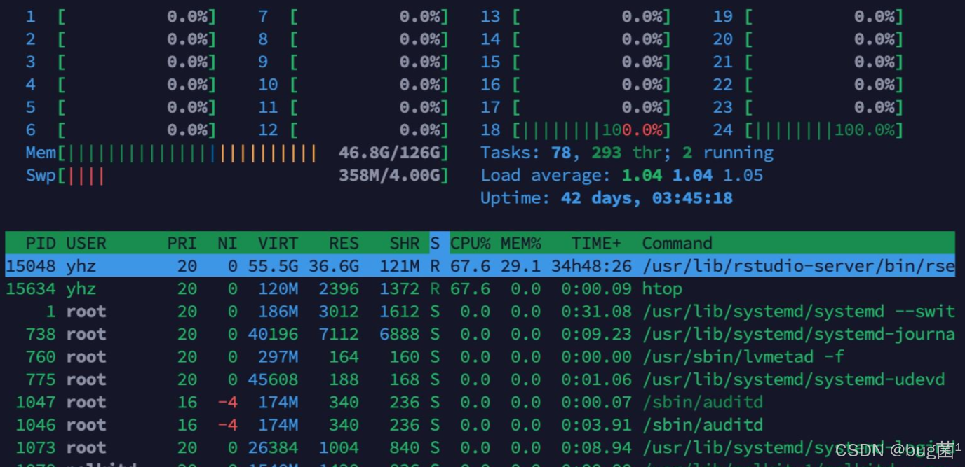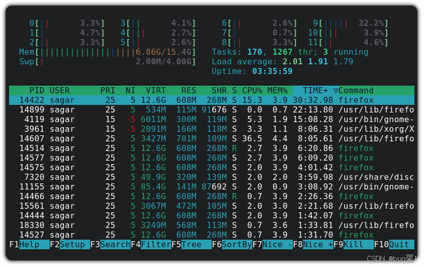 如下为实际执行htop命令时所反馈的各项系数占比: