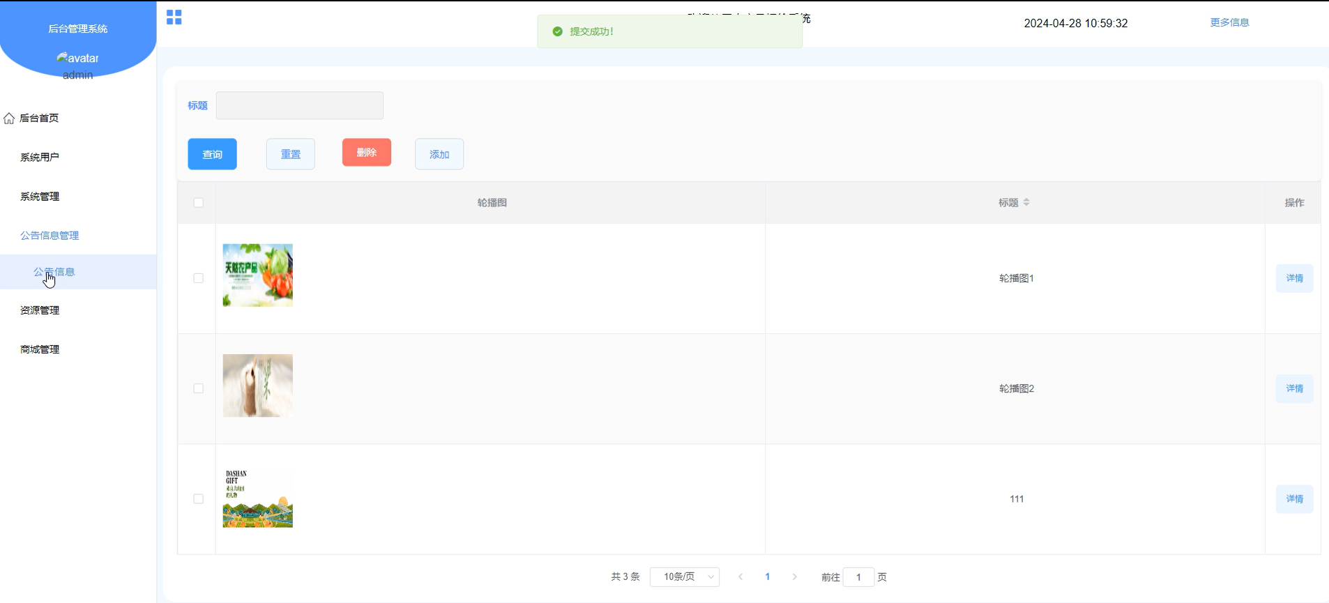 系统管理-管理员权限(发布轮播图及修改、删除轮播图信息等)。