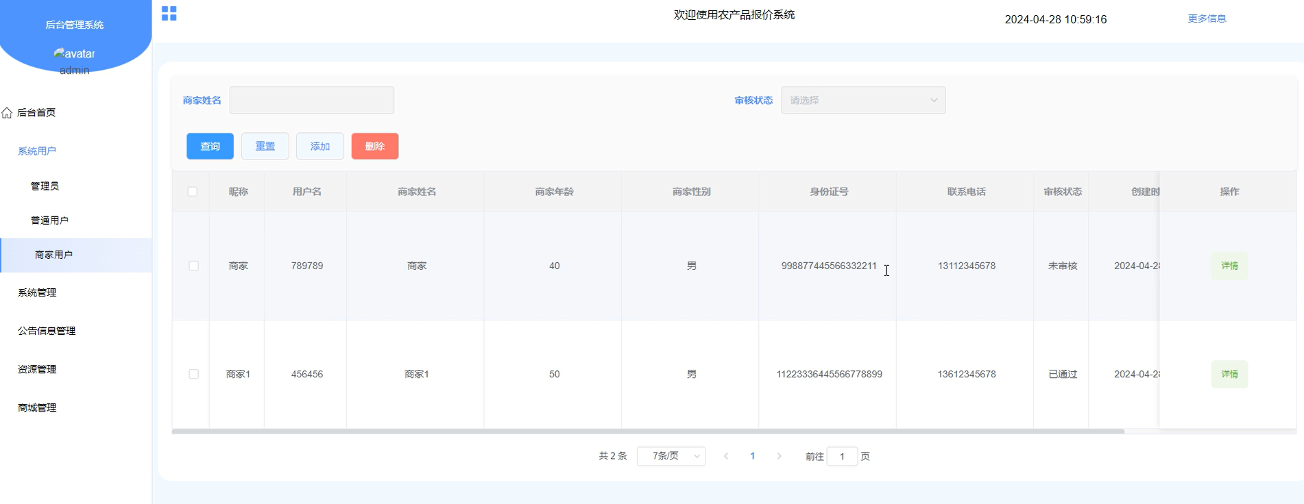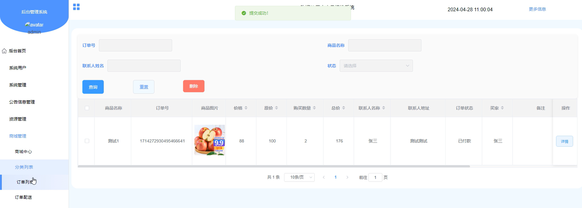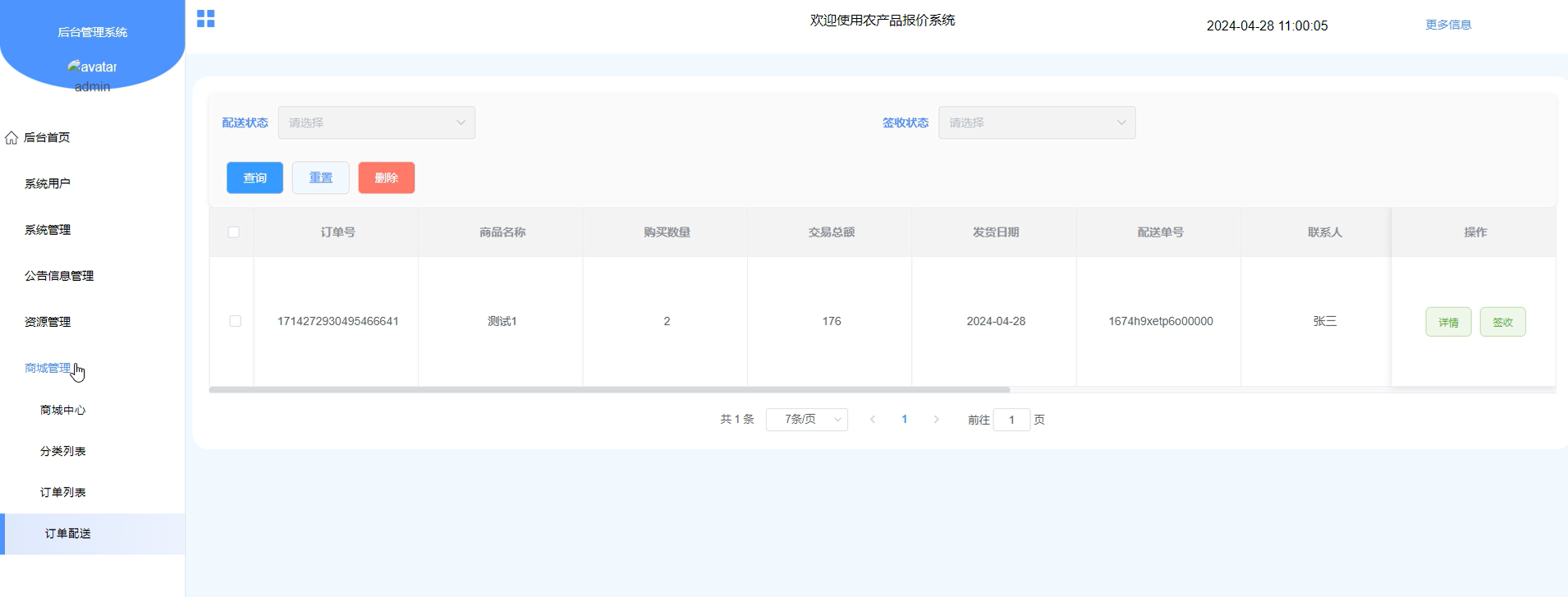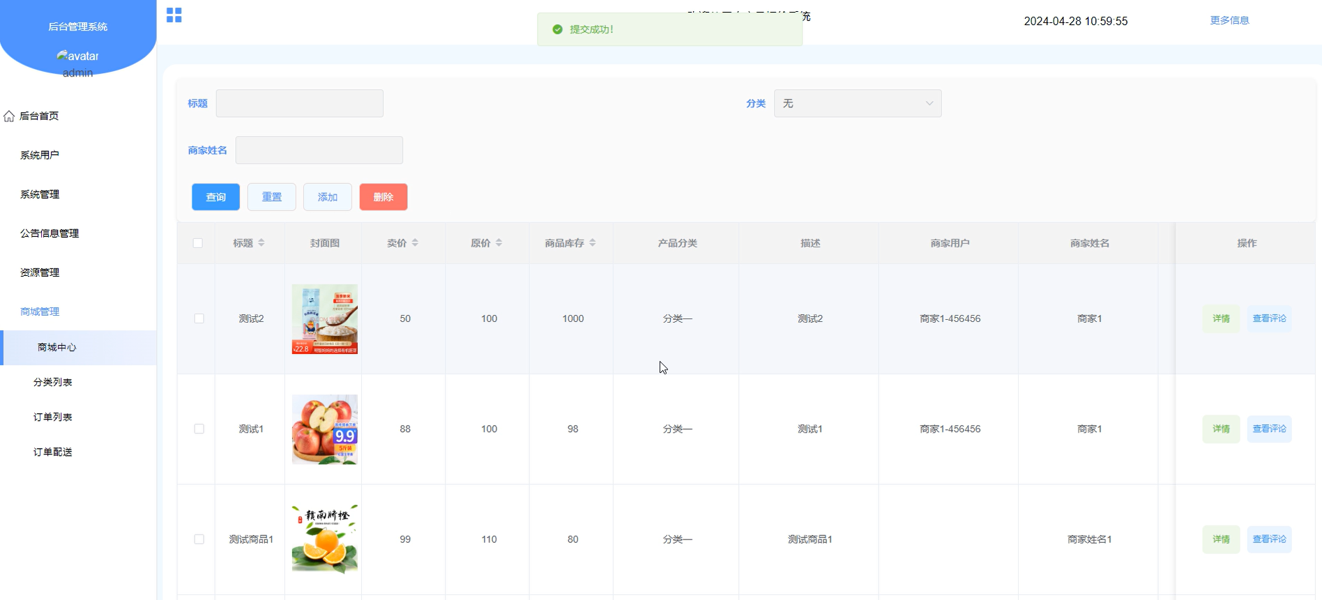 商城管理-管理员和商家权限(添加、删除、修改、查看商城中心商品信息和订单列表以及审核订单配送)。