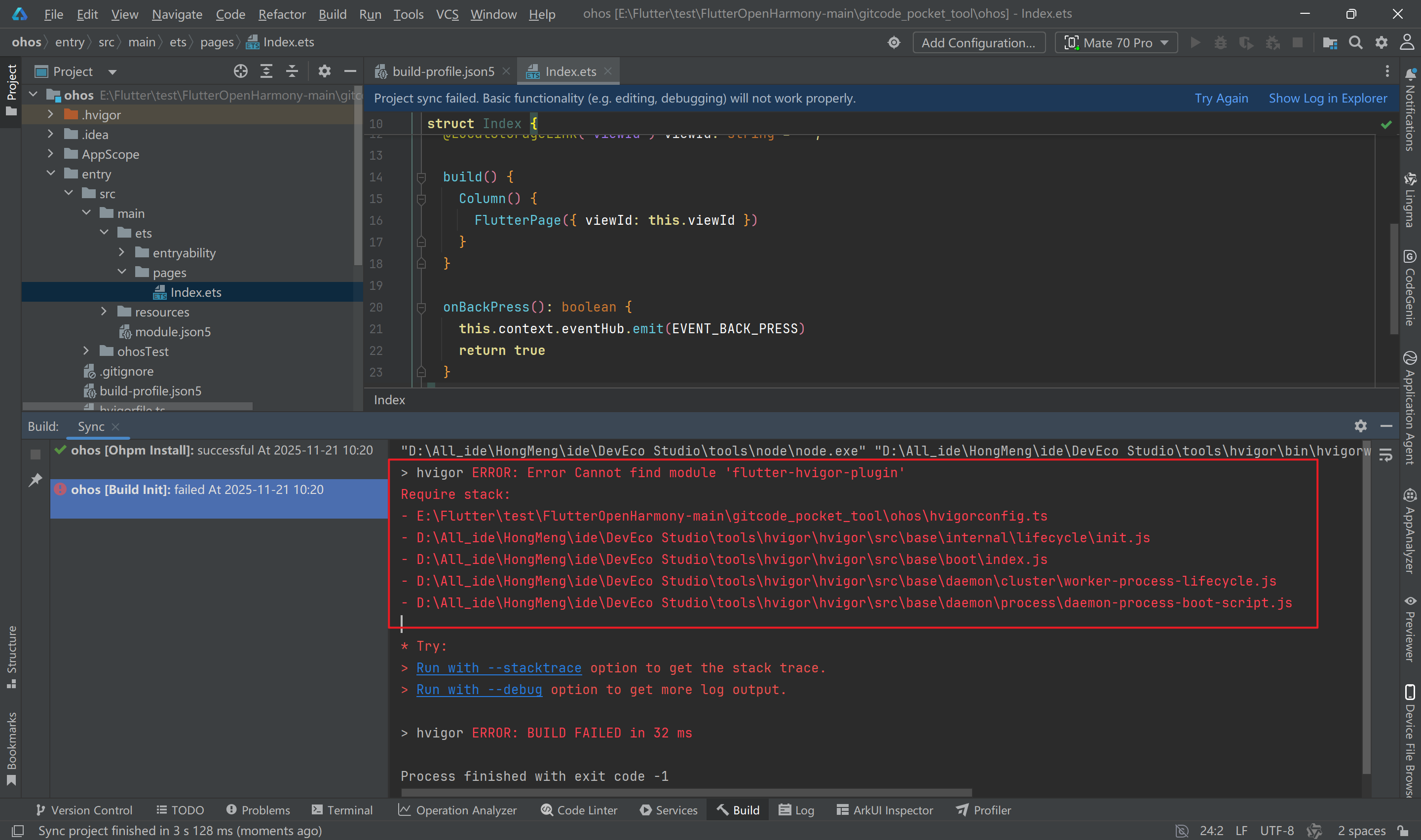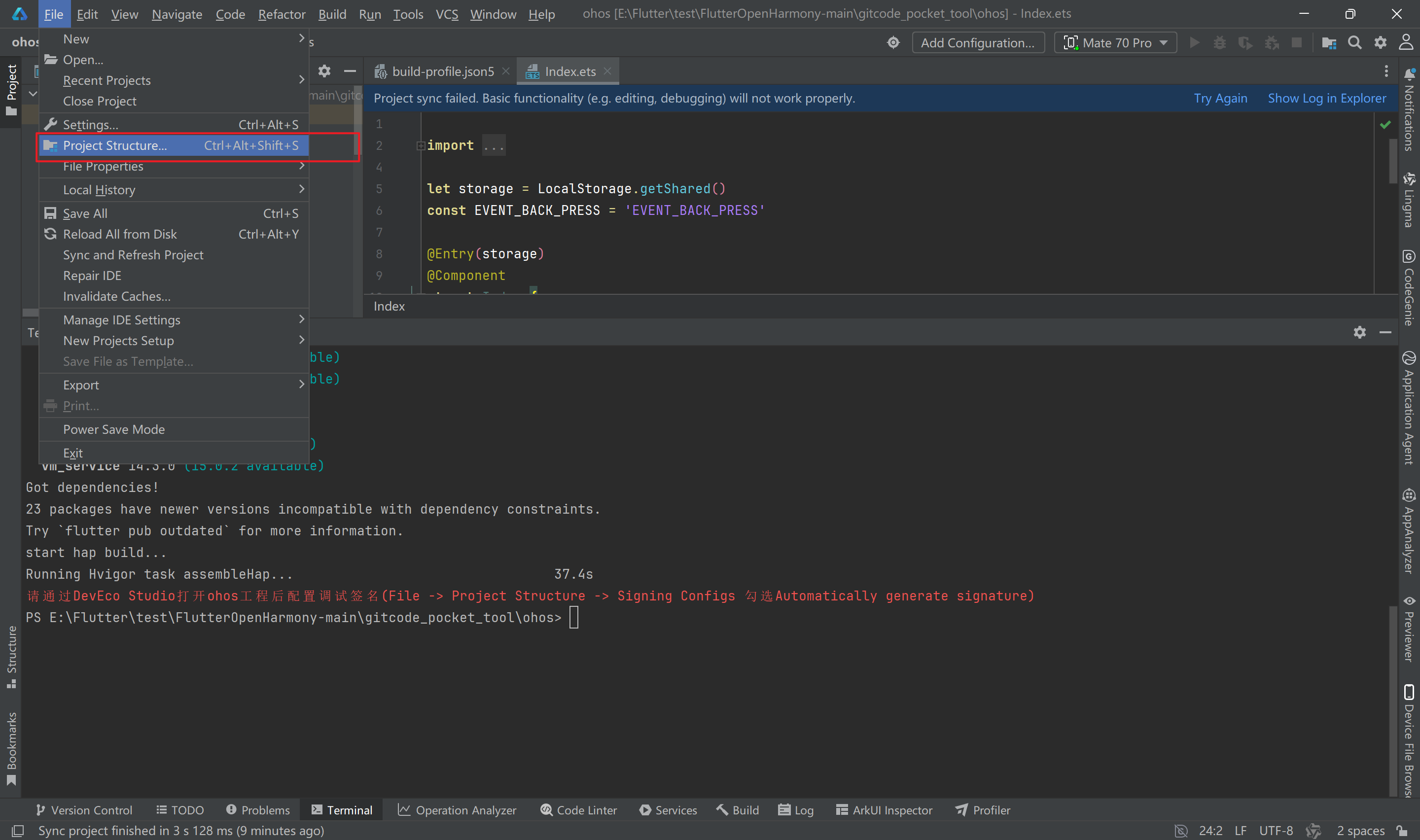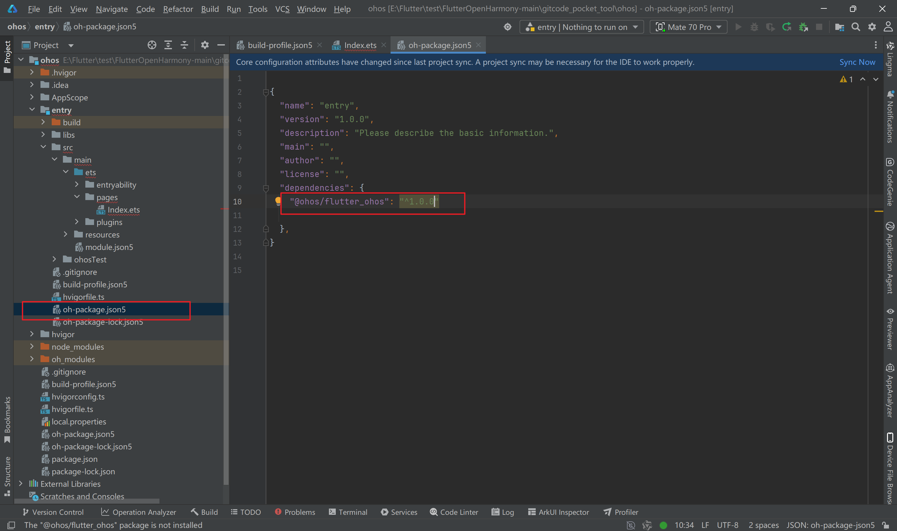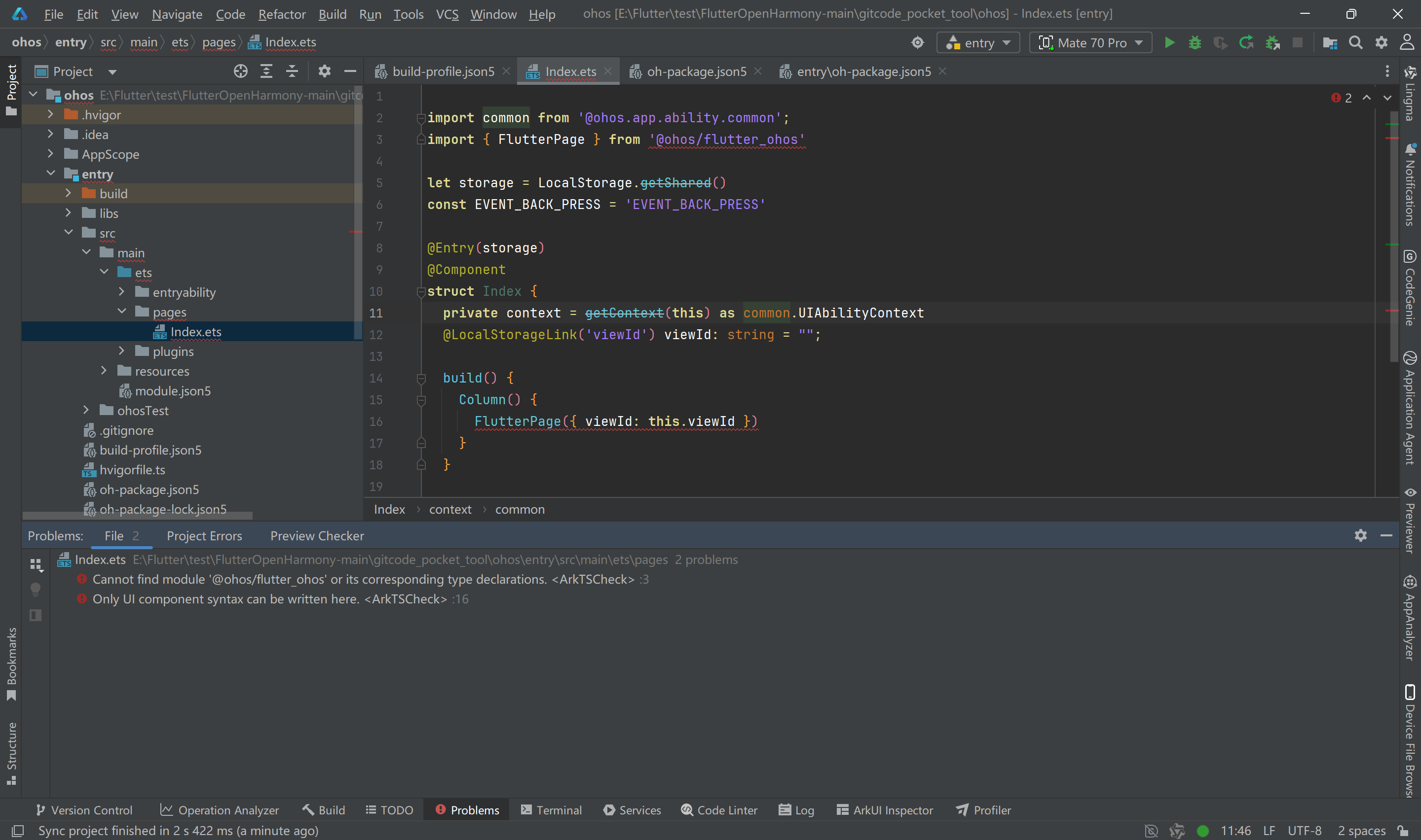 打开DevEco Studio选择Open打开gitcode_pocket_tool文件夹下面的ohos文件夹。发现打开有两个报错,这个报错是因为没导入flutter_ohos的模块。我们在oh-packge.json5中