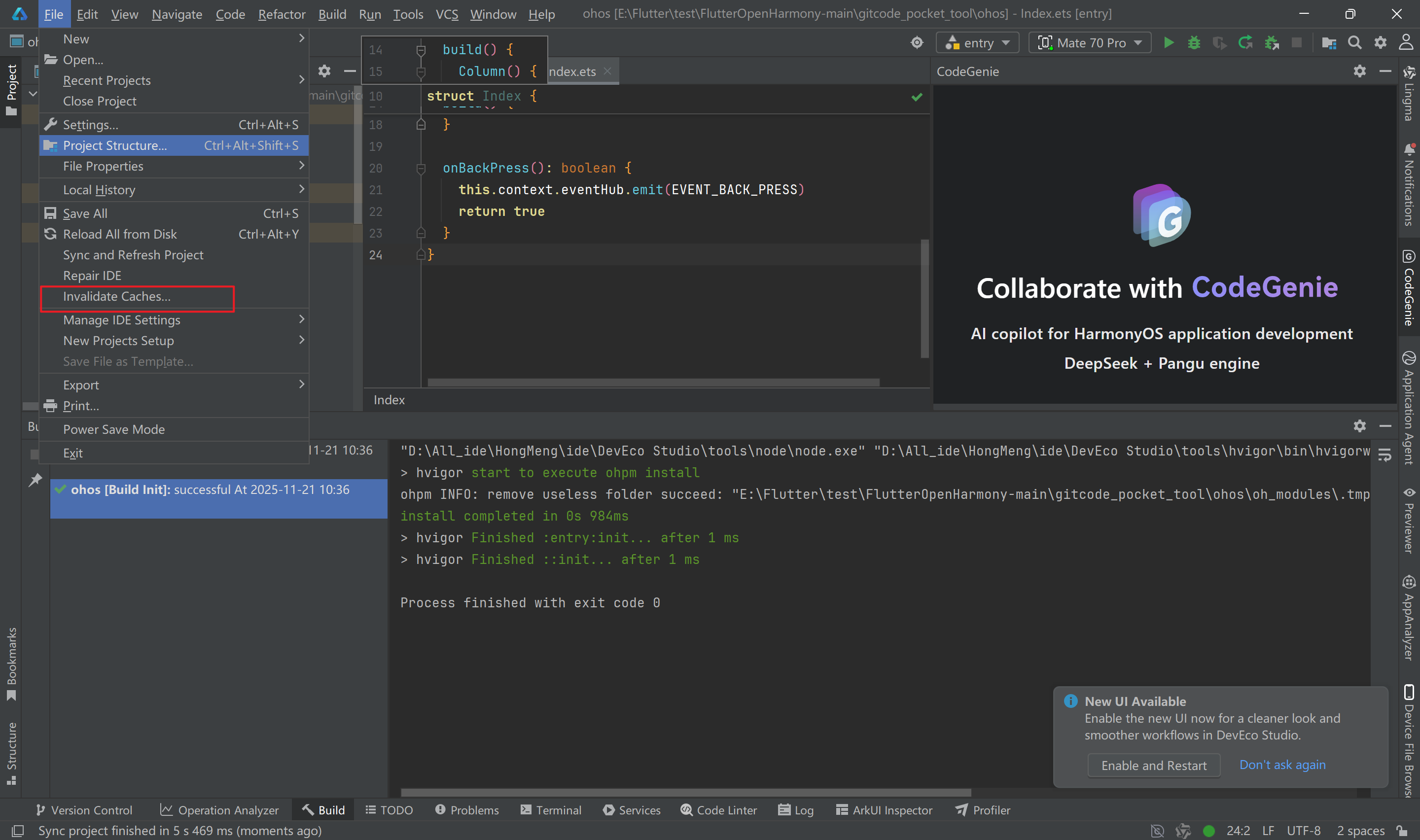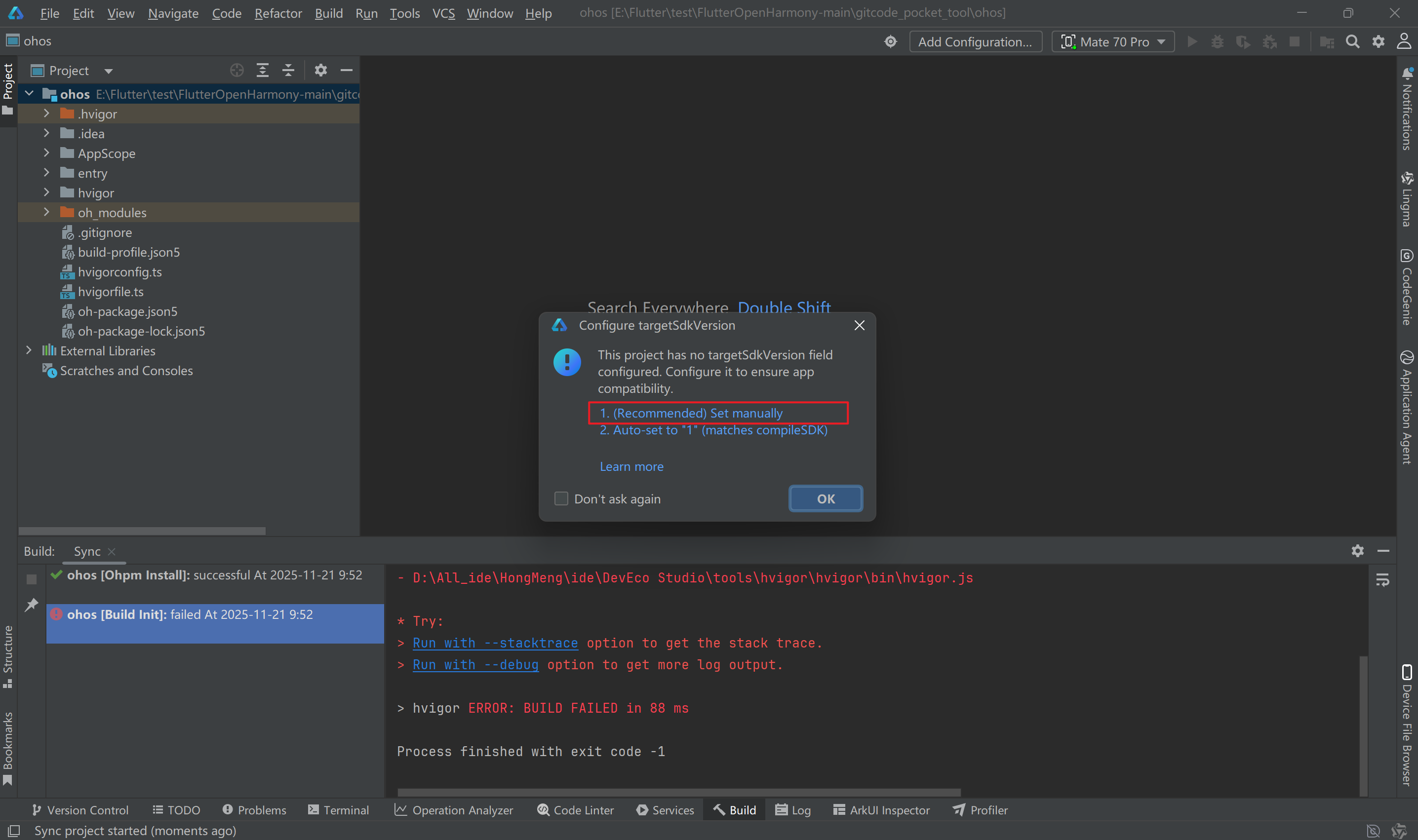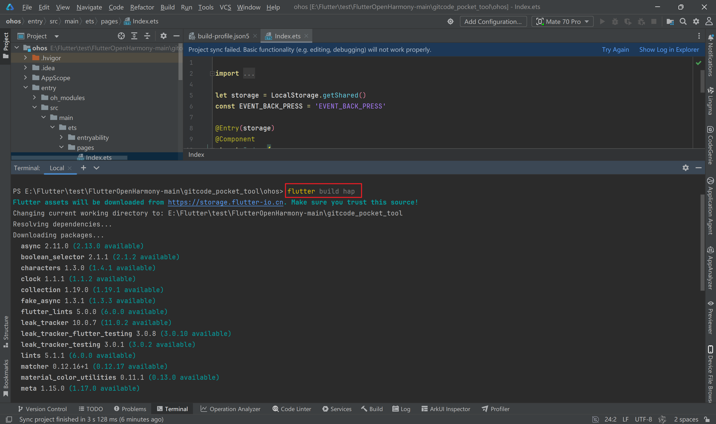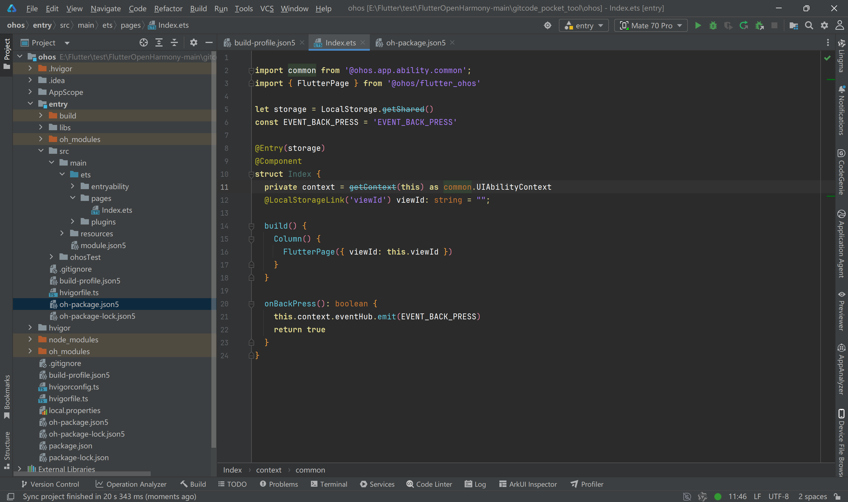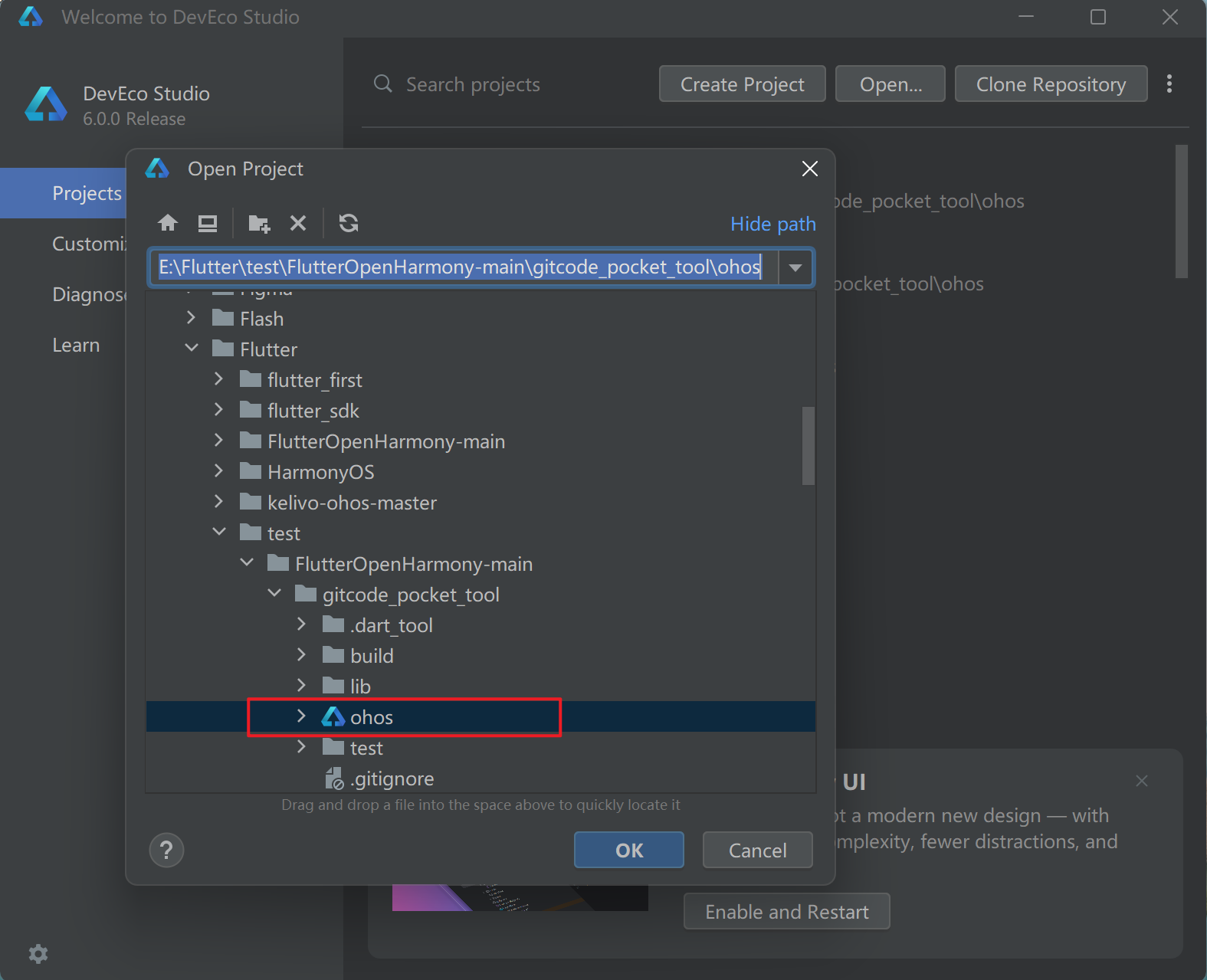 打开DevEco Studio选择Open打开gitcode_pocket_tool文件夹下面的ohos文件夹。发现打开有两个报错,这个报错是因为没导入flutter_ohos的模块。我们在oh-packge.json5中