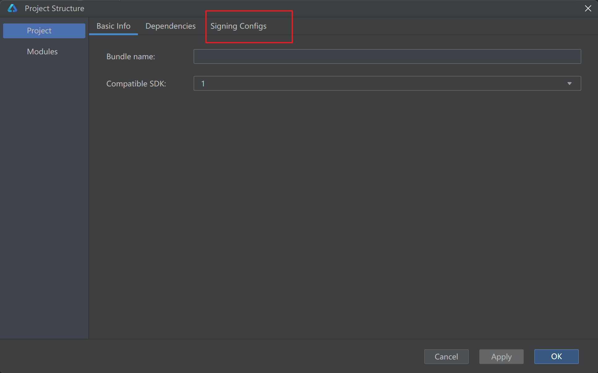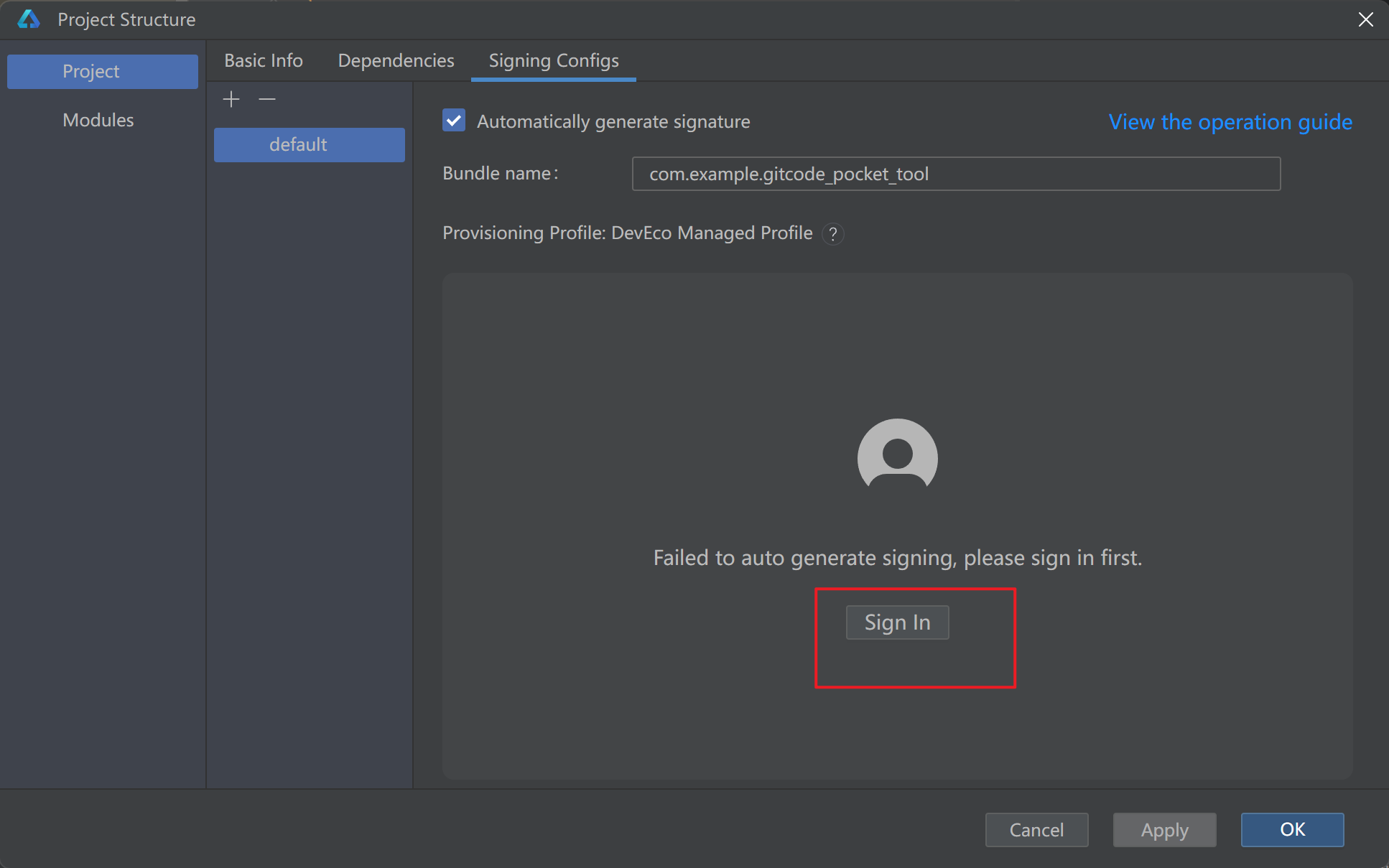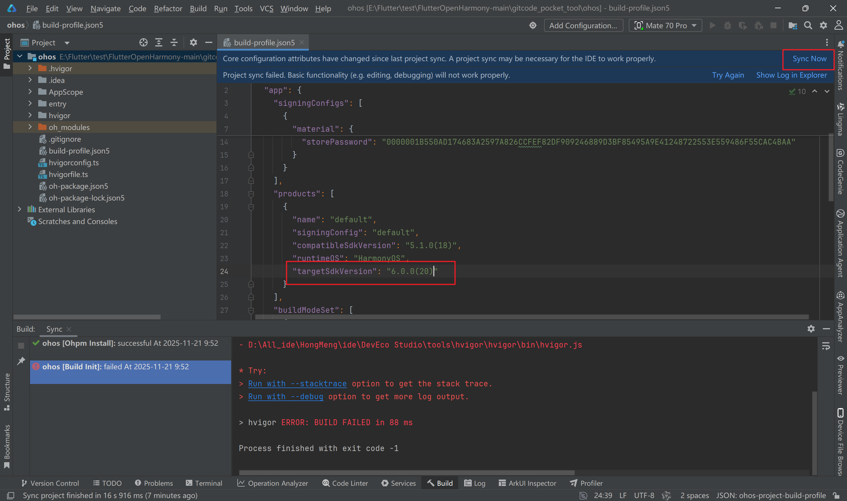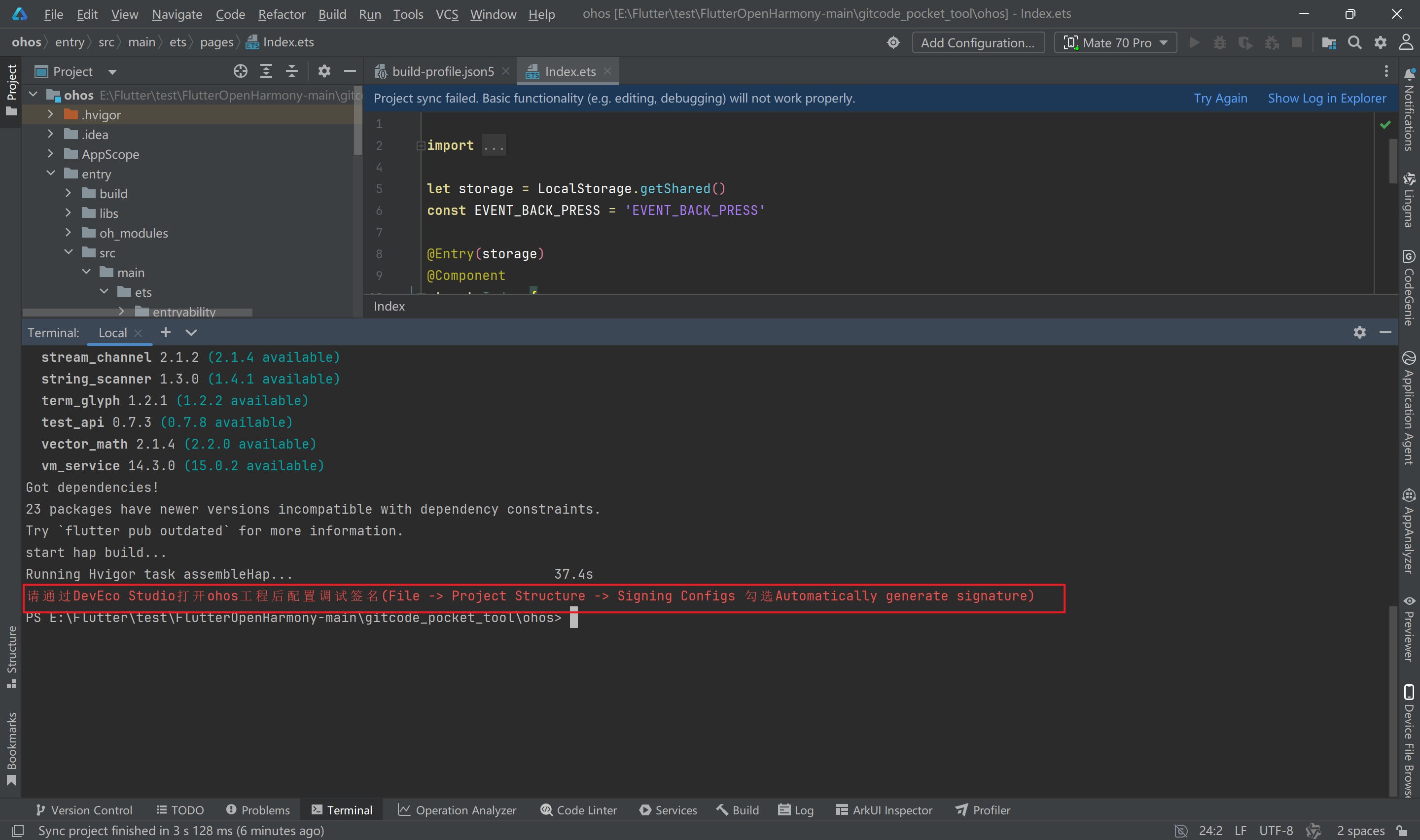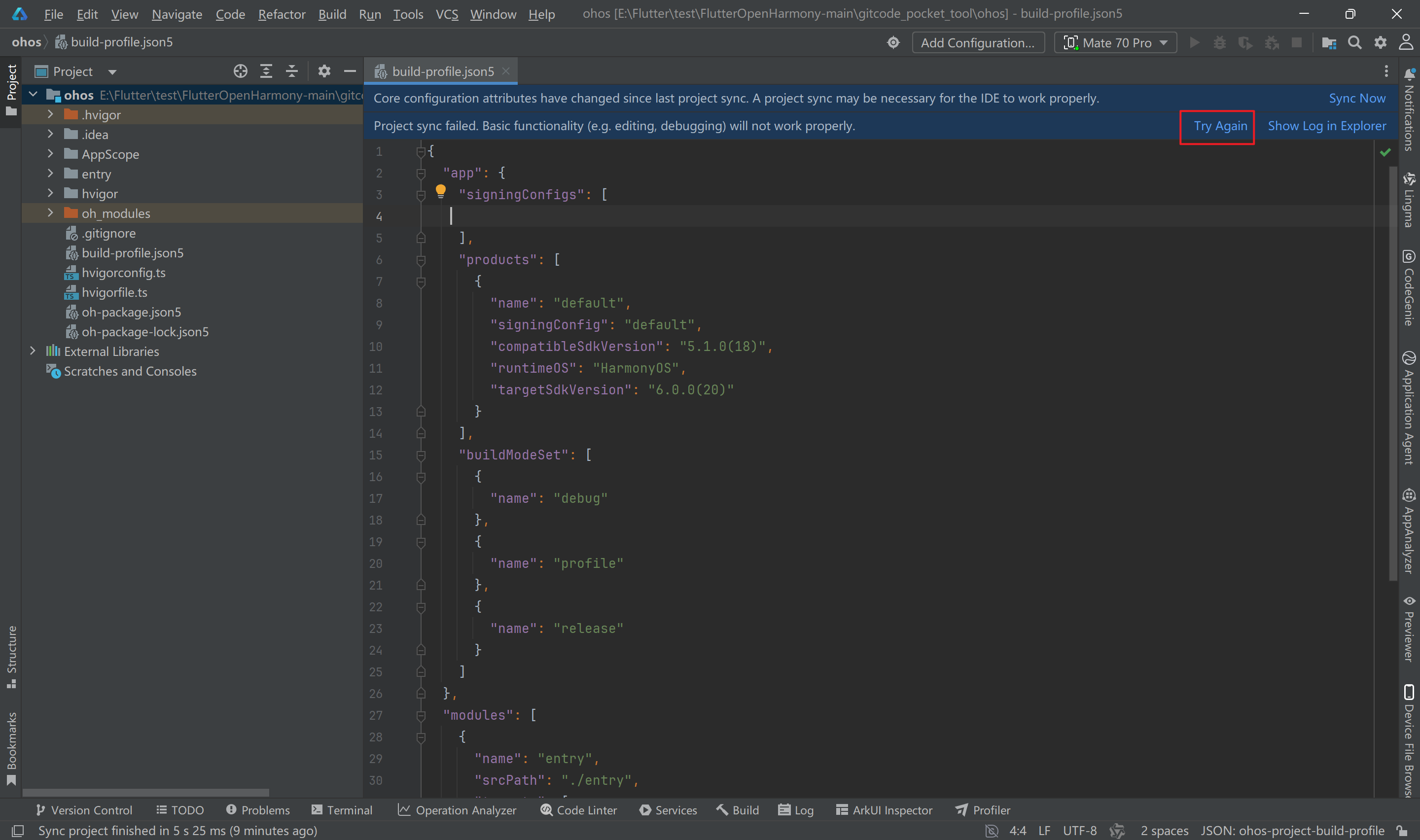由于我们是使用别人的项目,所以这里的调试签名不是我们自己的,我们需要把这段内容删除掉,然后点击Try again。让DevEco Studio自动构建自己的调试签名,