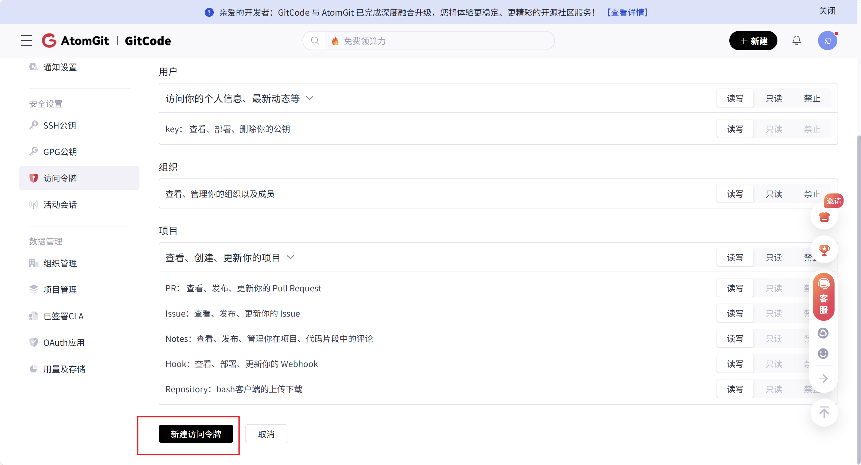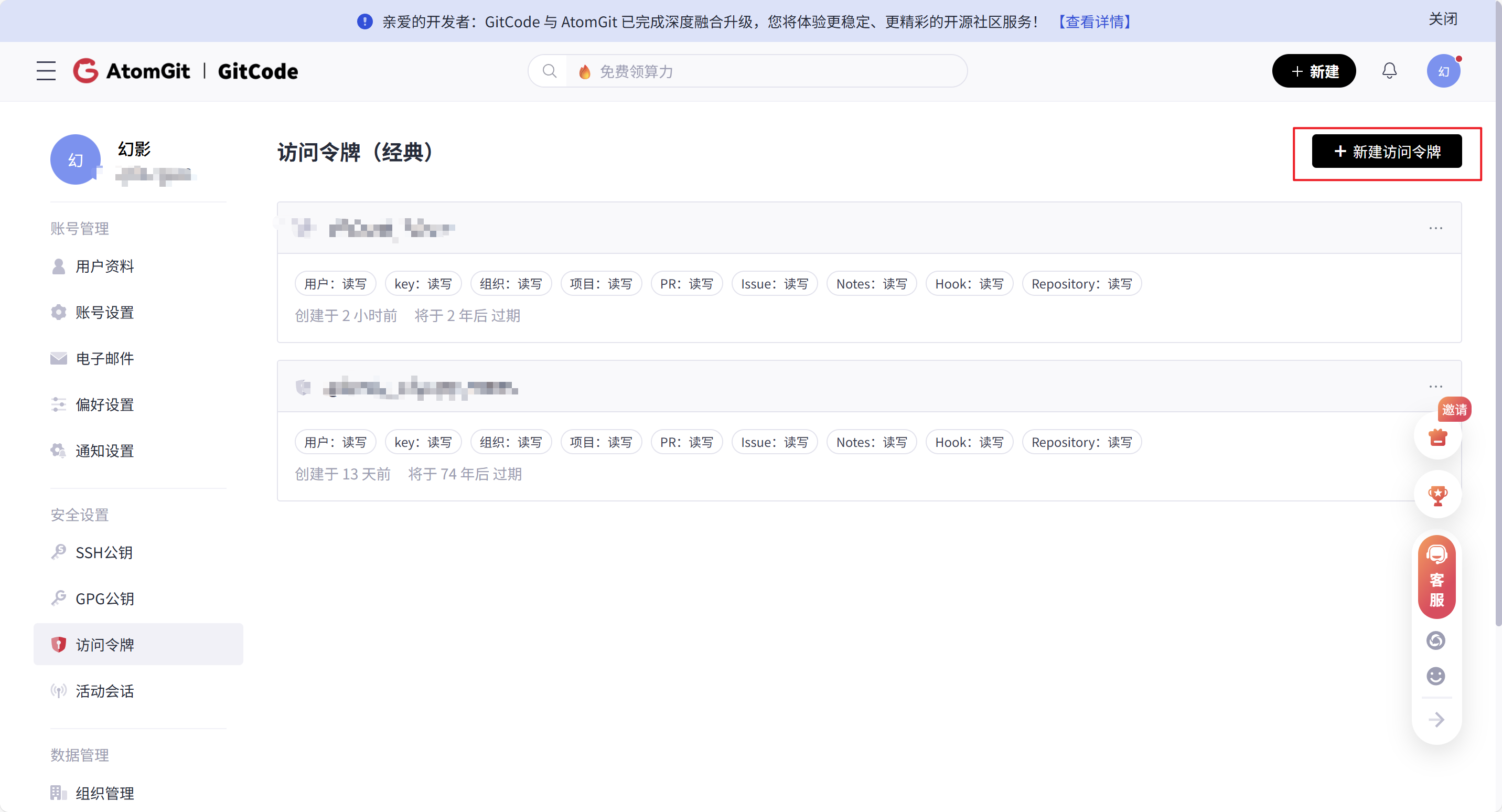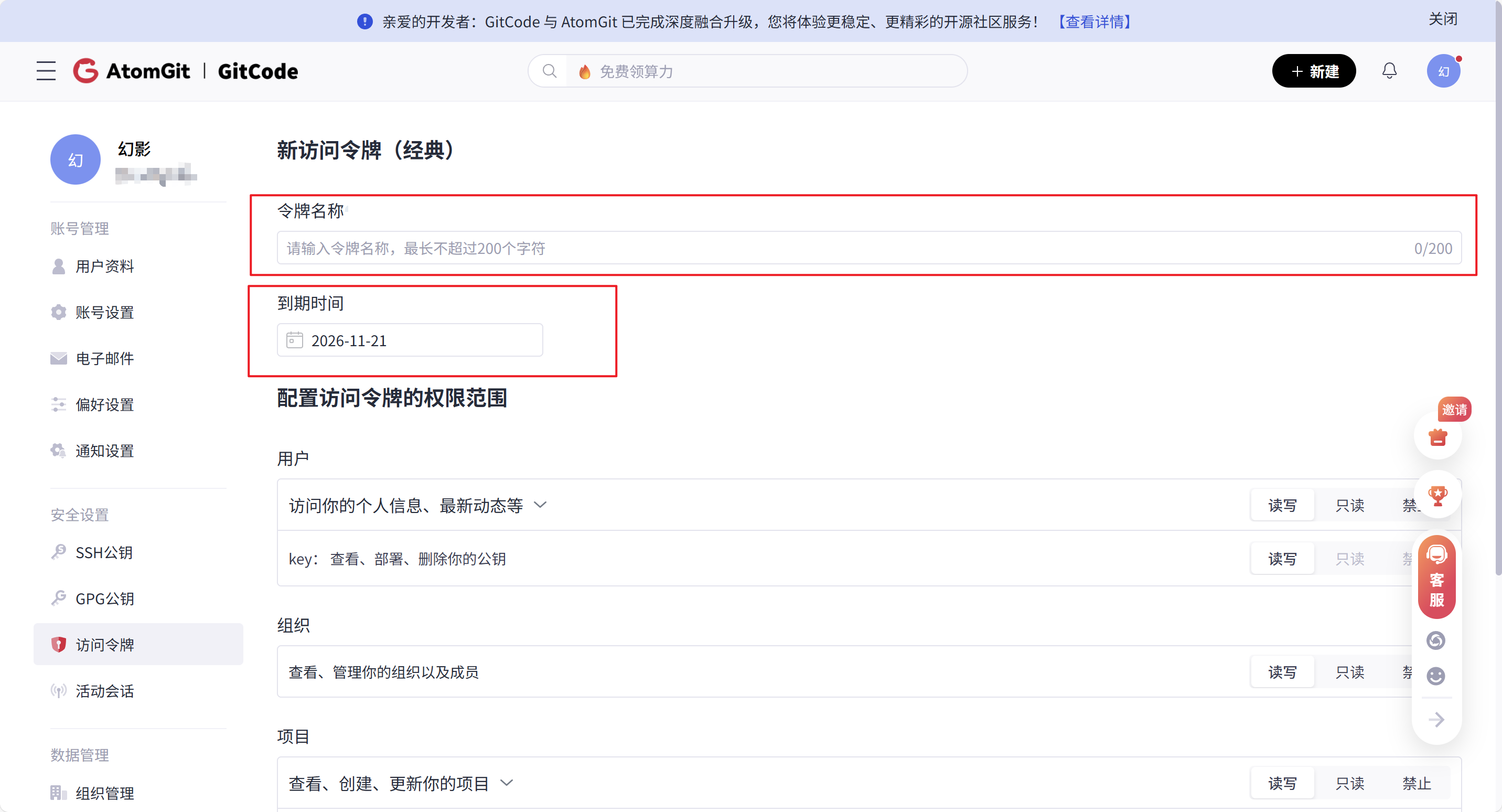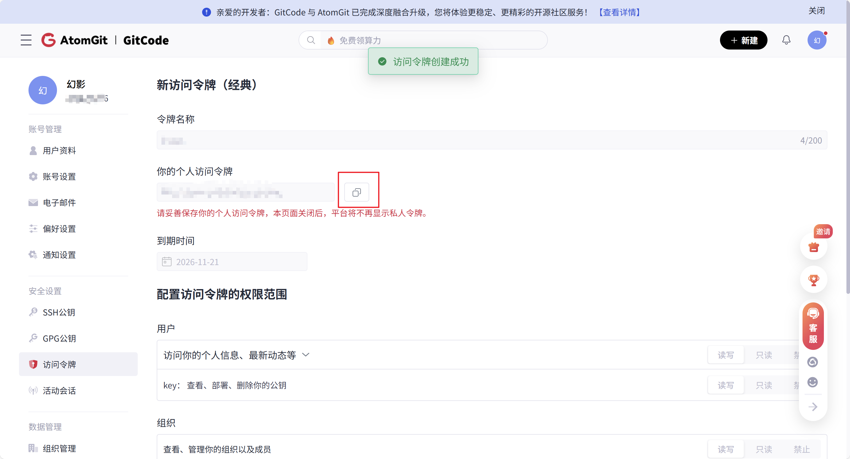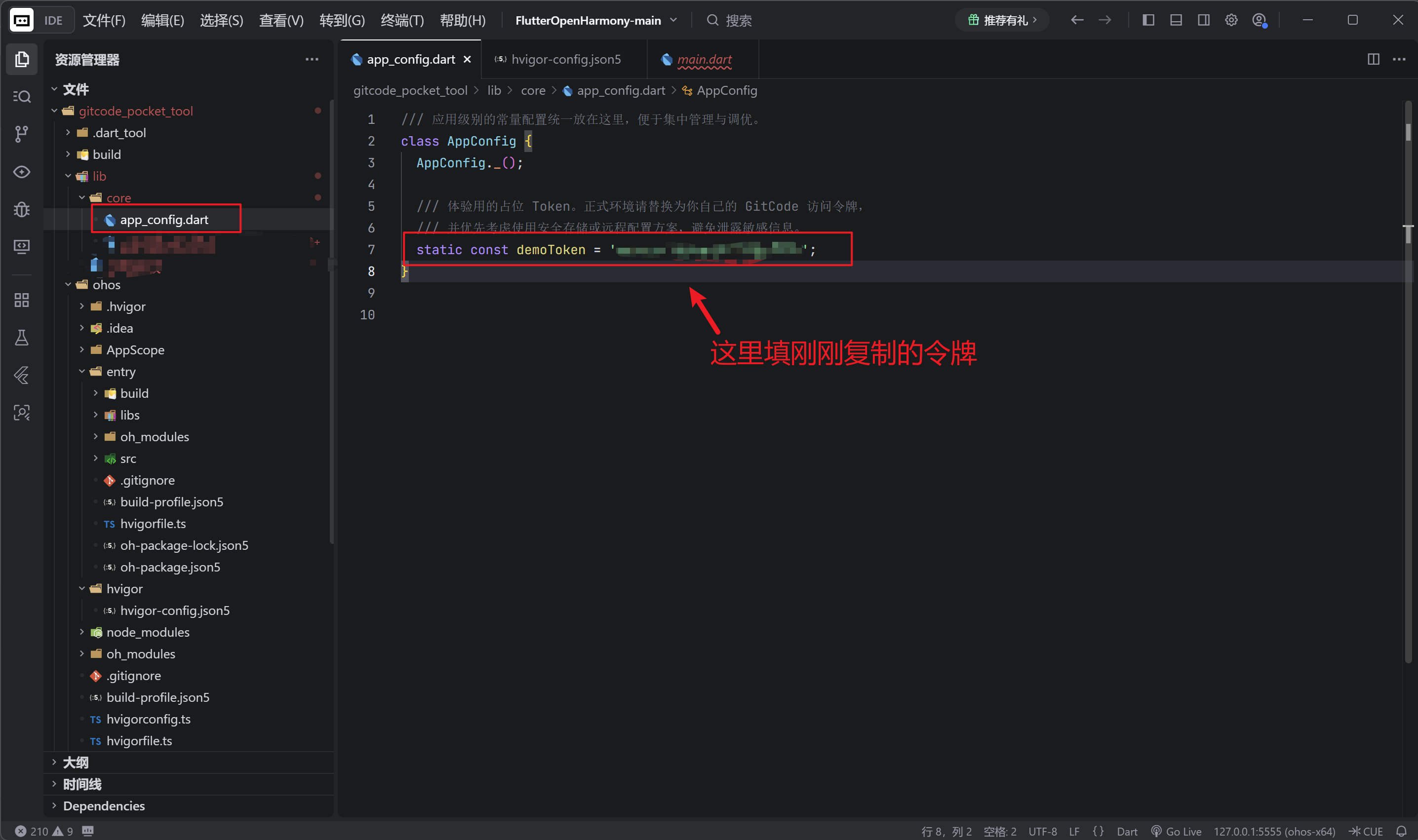 1.选择新建访问令牌--->2.填写自己的令牌名称,设置到期时间,然后点击新建访问令牌--->3.注意重要:新建成功后,一定要复制好这个访问令牌,并且保存好,不要让别人知道--->4.打开之前下载的FlutterOpenHarmony-main项目,找到里面的app_config.dare文件,把之前复制的访问令牌粘贴上去即可。