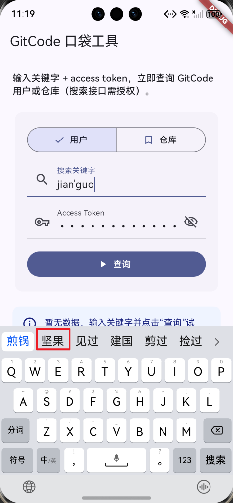 加入"@ohos/flutter_ohos": "^1.0.0",然后点右上角Sync Now即可。Sync Now后可以看到项目没有报错了,我们直接运行项目即可。可以看到我们的项目成功运行了,然后我们试试搜索关键字的功能,看看功能是否正常。搜索"坚果",点击查询,查看能不能查询到用户。可以看到我们已经成功查询出和"坚果"相关的用户。