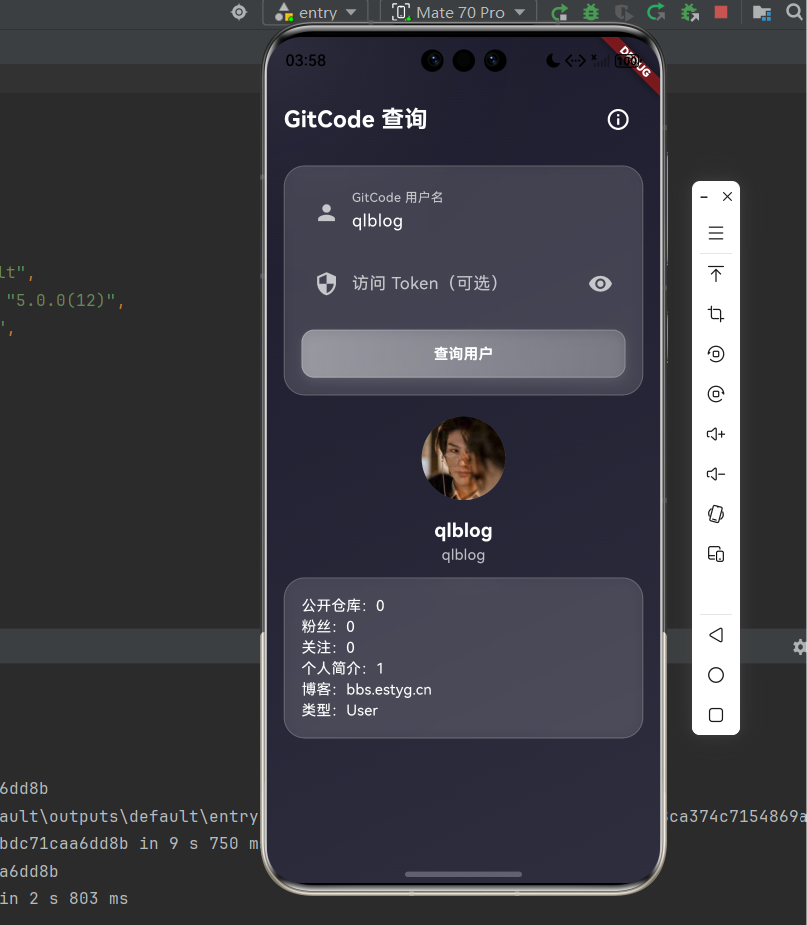 老规矩,lib下创建pages文件夹 然后创建文件 lib/pages是文件夹 user_search_page.dart就是我们要创建的名称,后续不再做此类解释。这里cd表示进入目录oh_gitcode也就是进入到我们的oh_gitcode项目目录实际上根据自己的创建为主,后续此类解释不再过多讲解。这个就表示没有报错,代码正常编译完成,只需要进入开发工具进行相关签名即可完成,然后就可以运行代码到