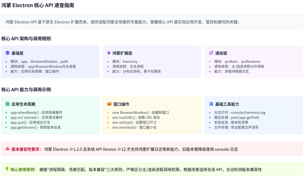 鸿蒙 Electron 核心 API 的使用需遵循“进程隔离、场景匹配、版本兼容”三大核心原则: